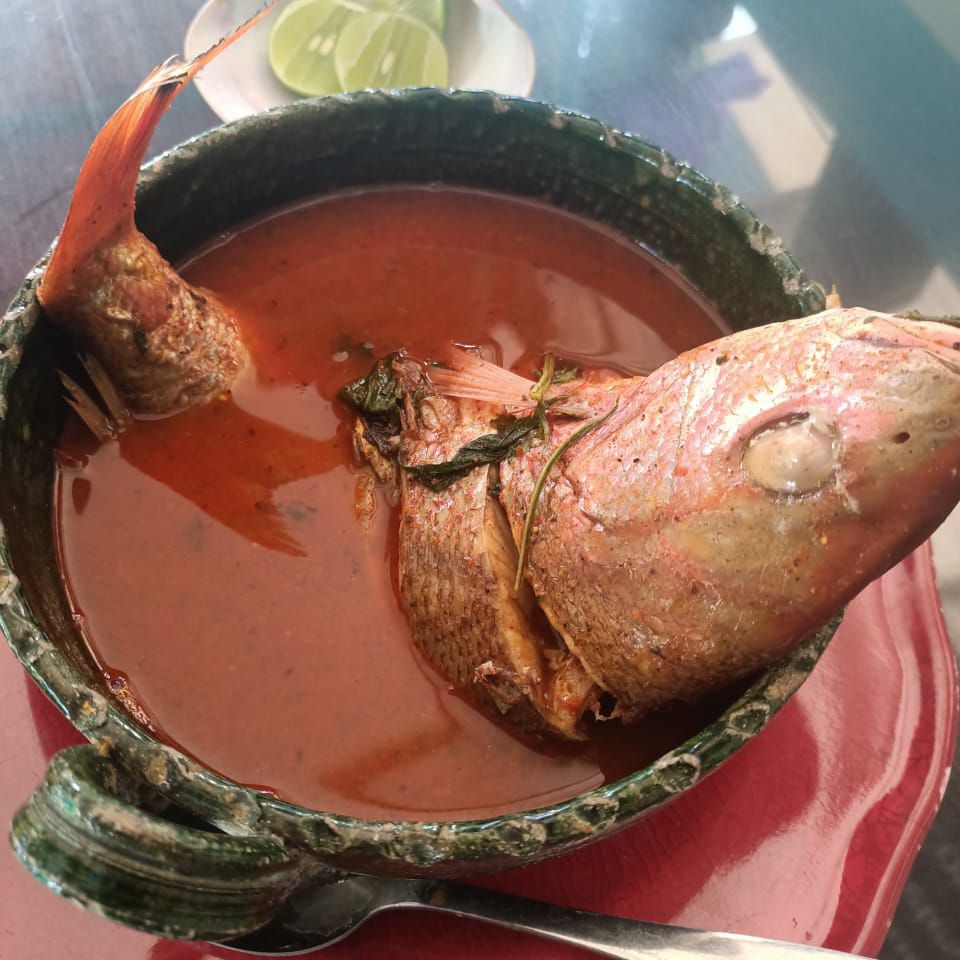 Exquisito caldo de pescado y camarón a base de chile guajillo acompañado de cilantro, cebolla y chile con tostadas