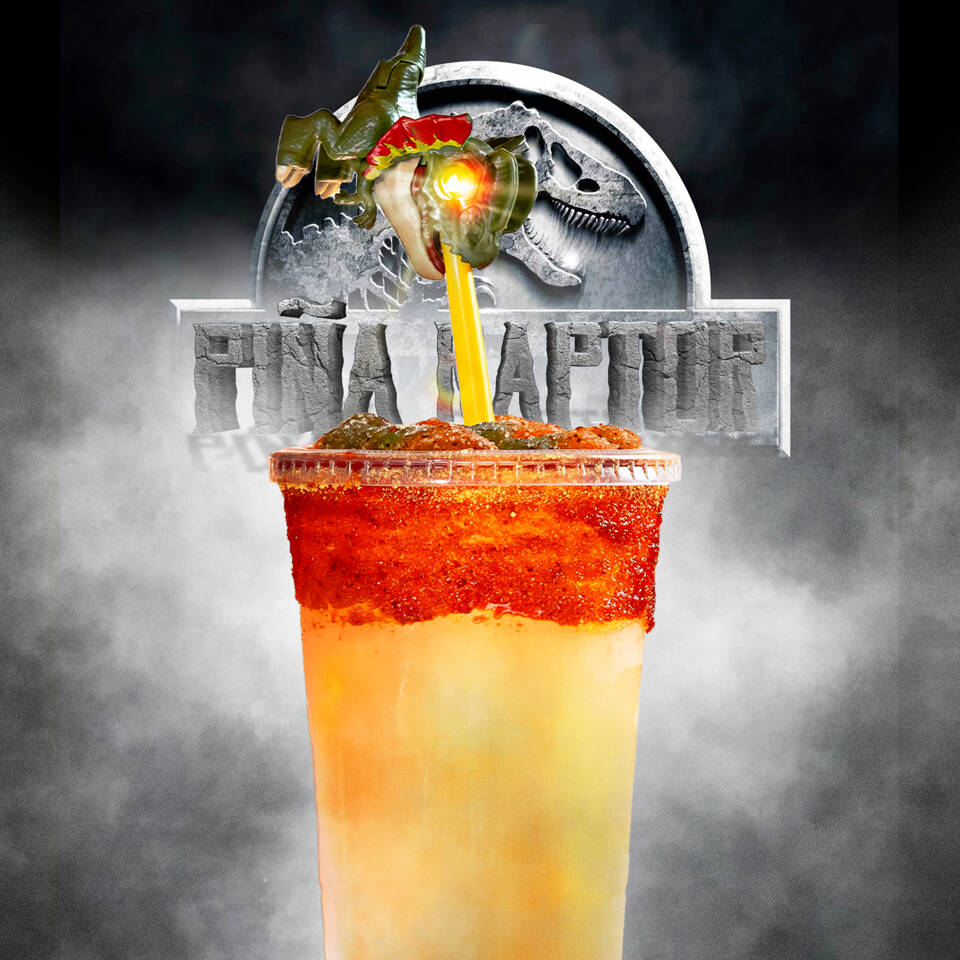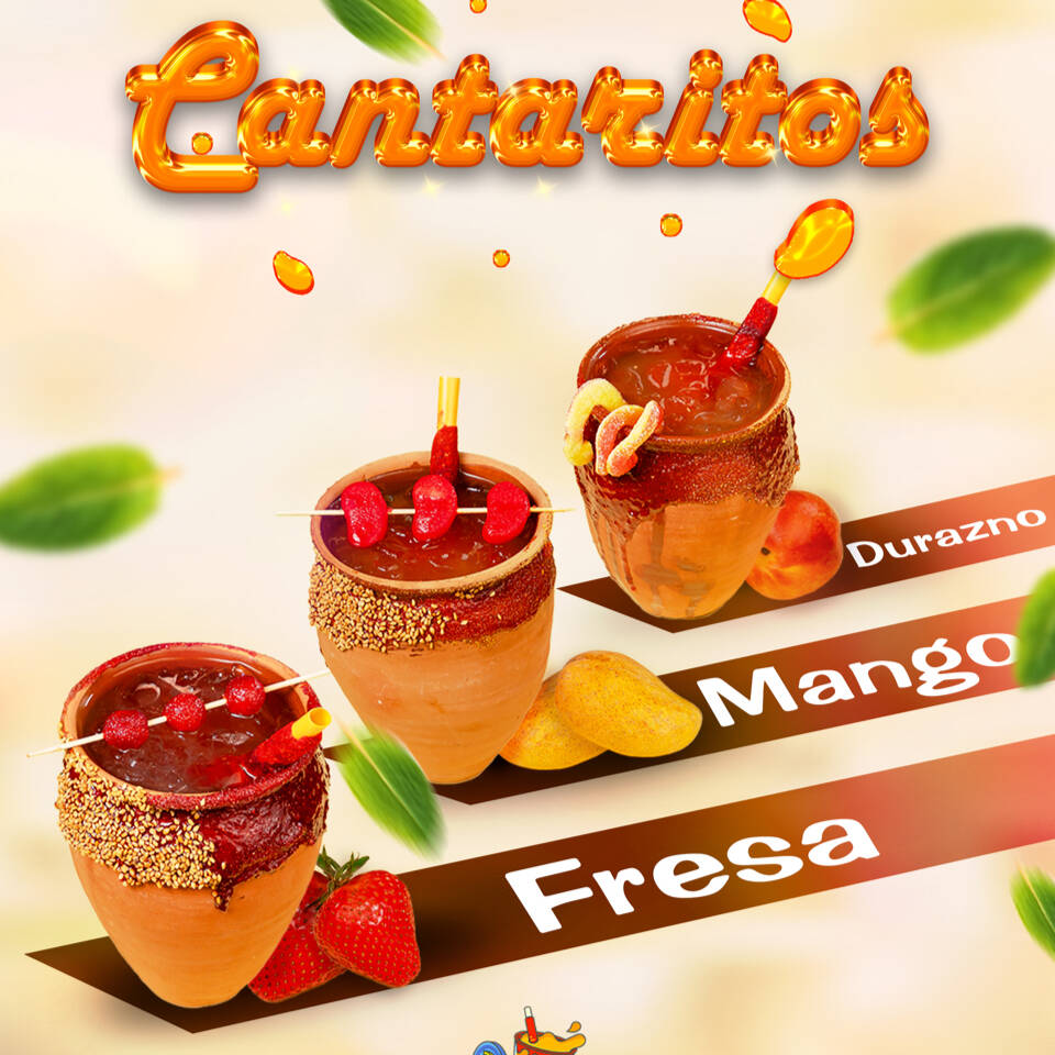 Una explosión de sabor con nuestra receta especial, con: limón, salsas negras y picantes, clamato y Chamoy, con cacahuates, pepino, jicama, cueritos, salchicha y gomitas de tamarindo