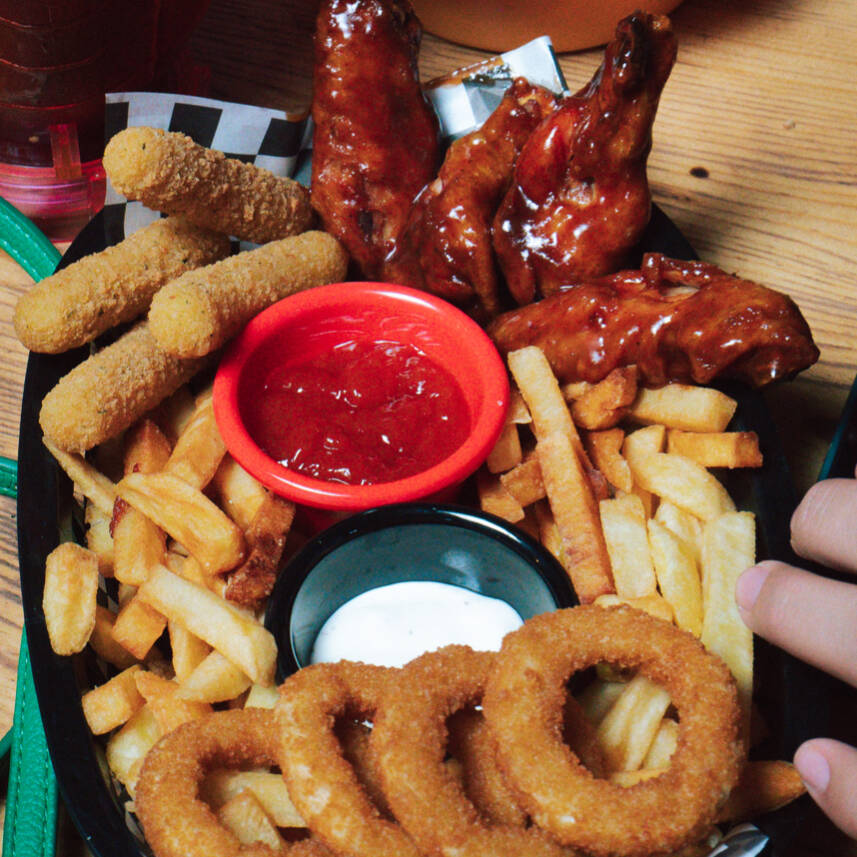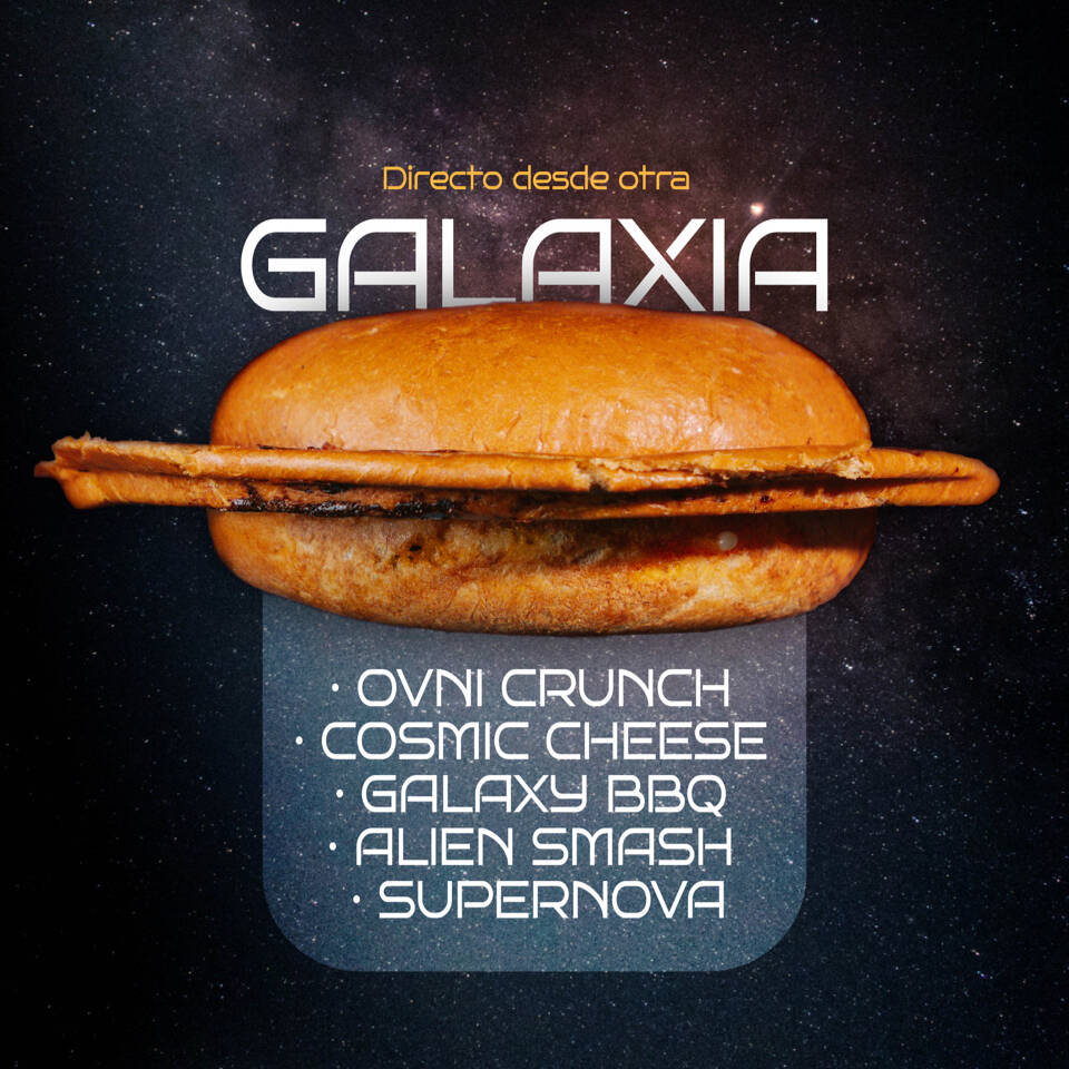 Ovni Burger con pan brioche, Carne de Res, Palomitas de pollo, Salsa BBQ, Queso Manchego, Queso Cheddar.