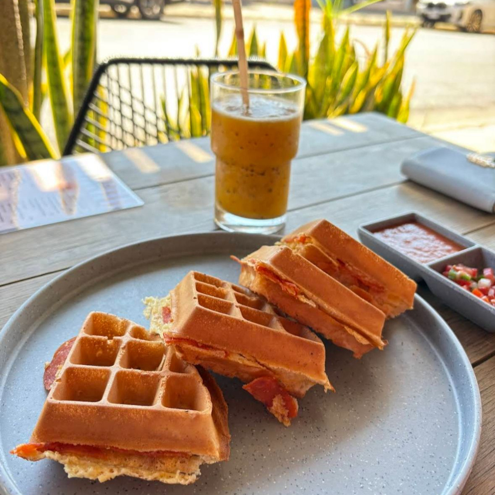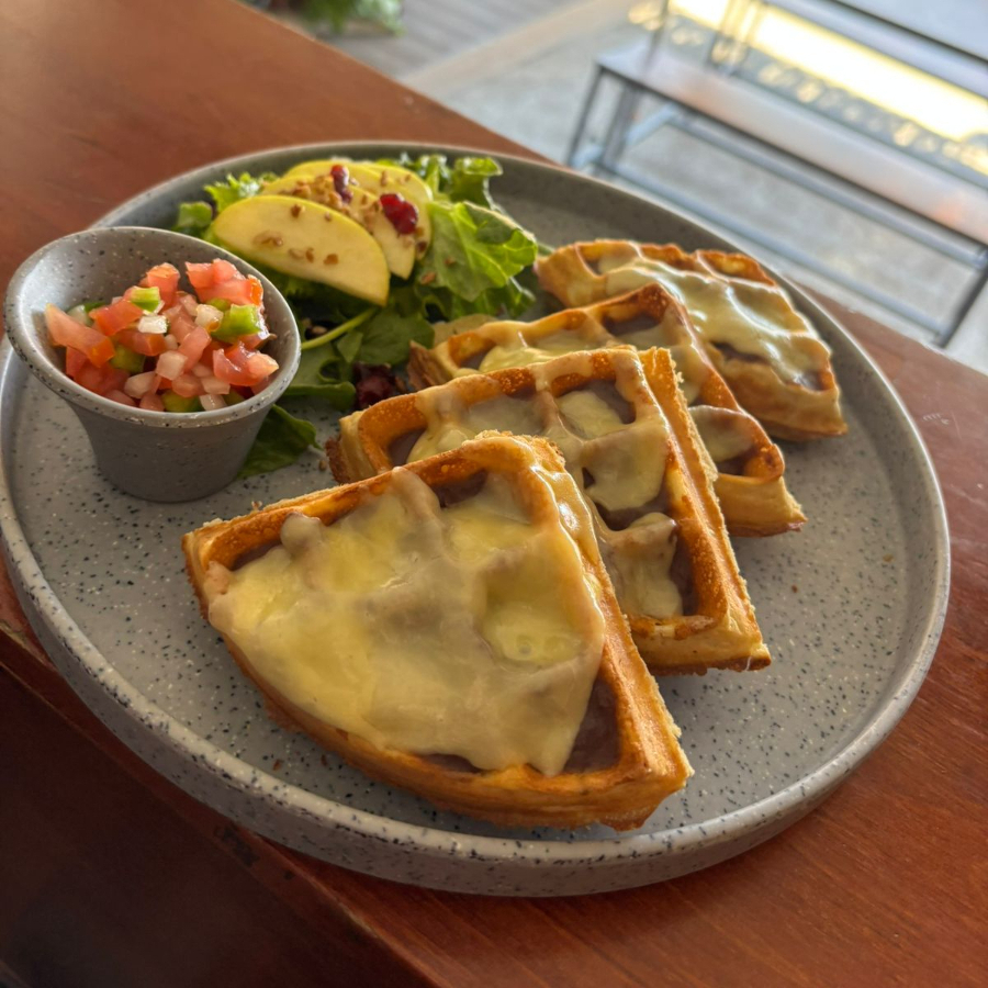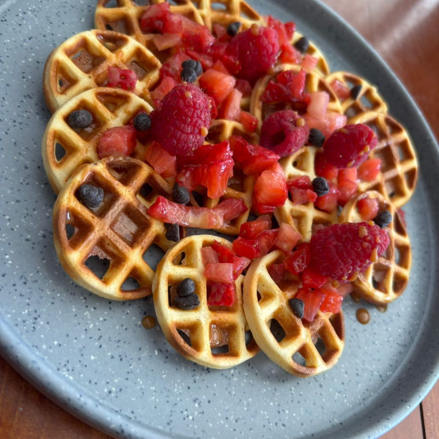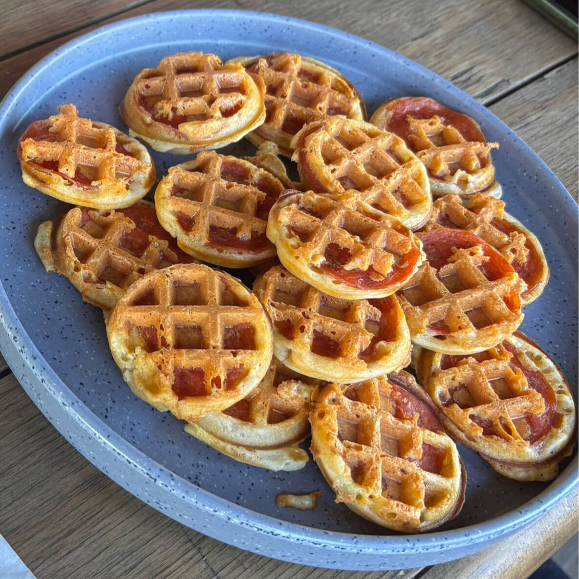 Mini waffles con relleno de pepperoni, queso manchego fundido y salsa italiana para acompañar.