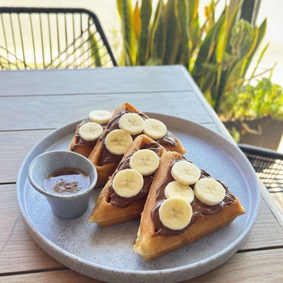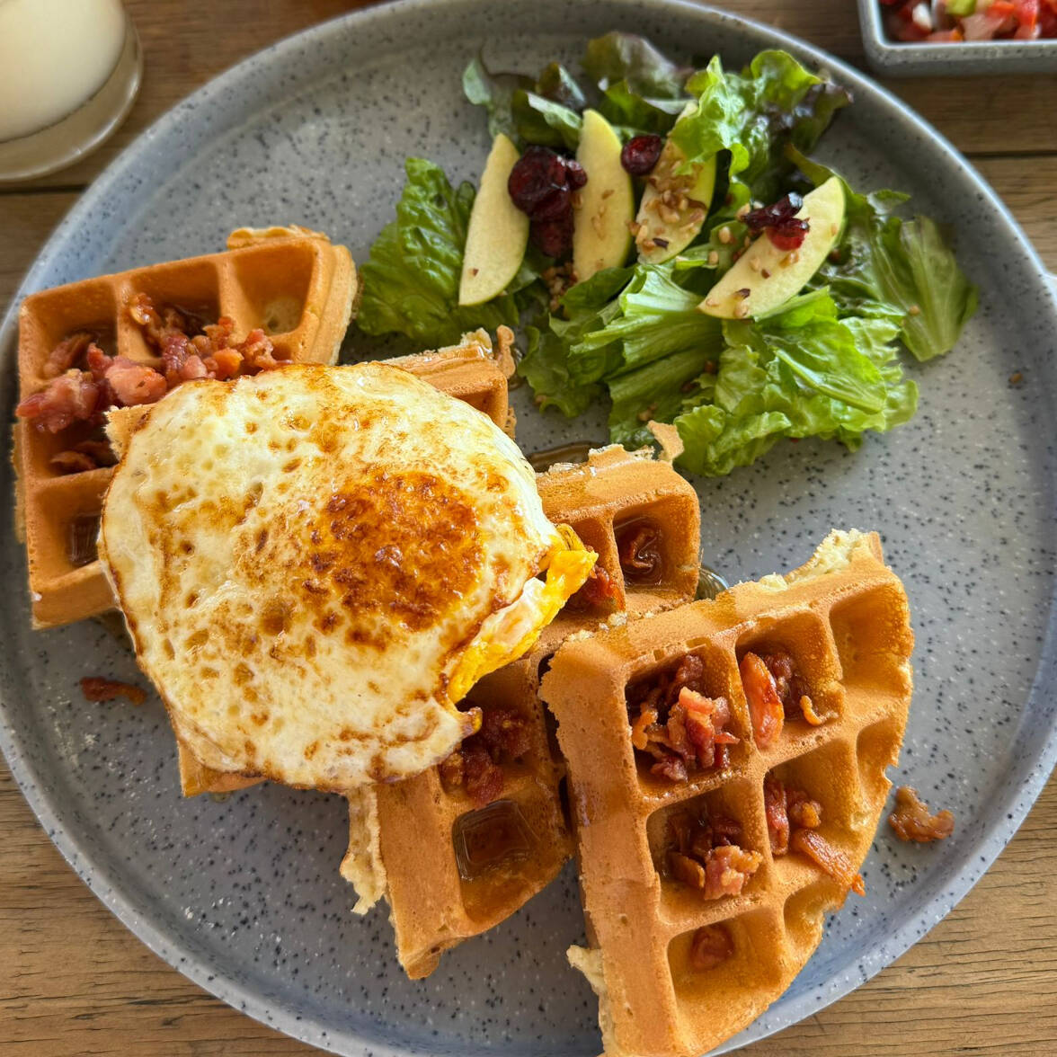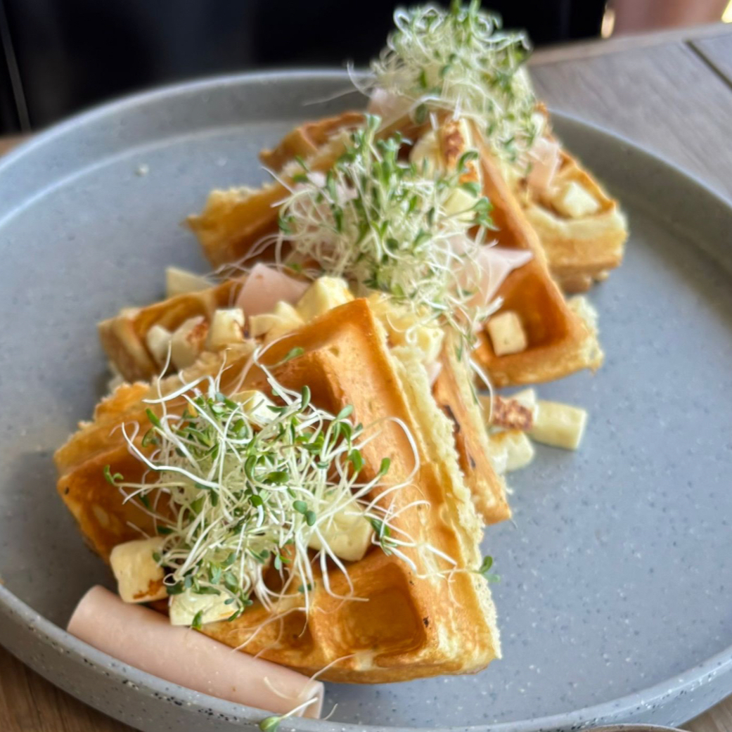 Mini waffles con relleno de pepperoni, queso manchego fundido y salsa italiana para acompañar.