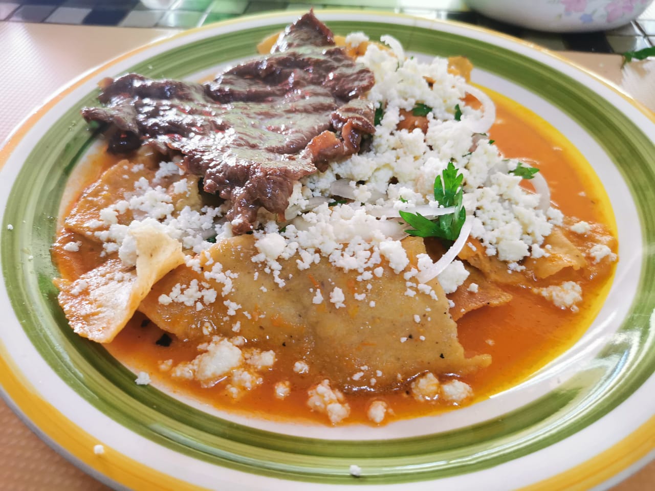 salsa de tomate, tortillas doradas, cebolla perejil, queso y crema, se acompaña con carne o huevos
