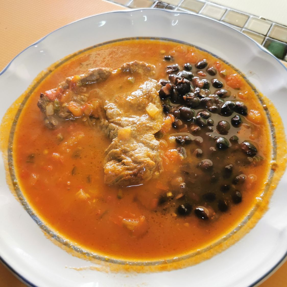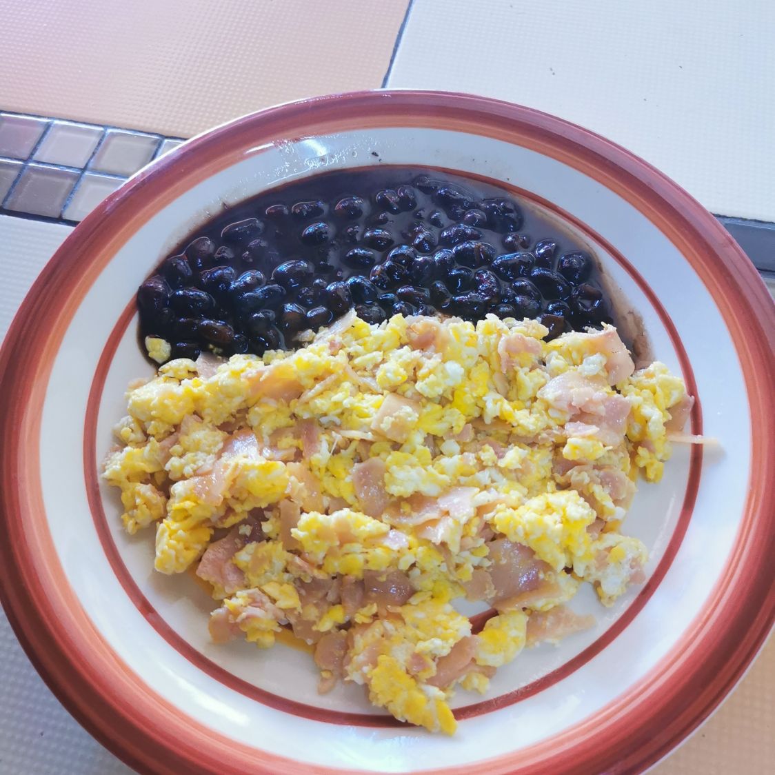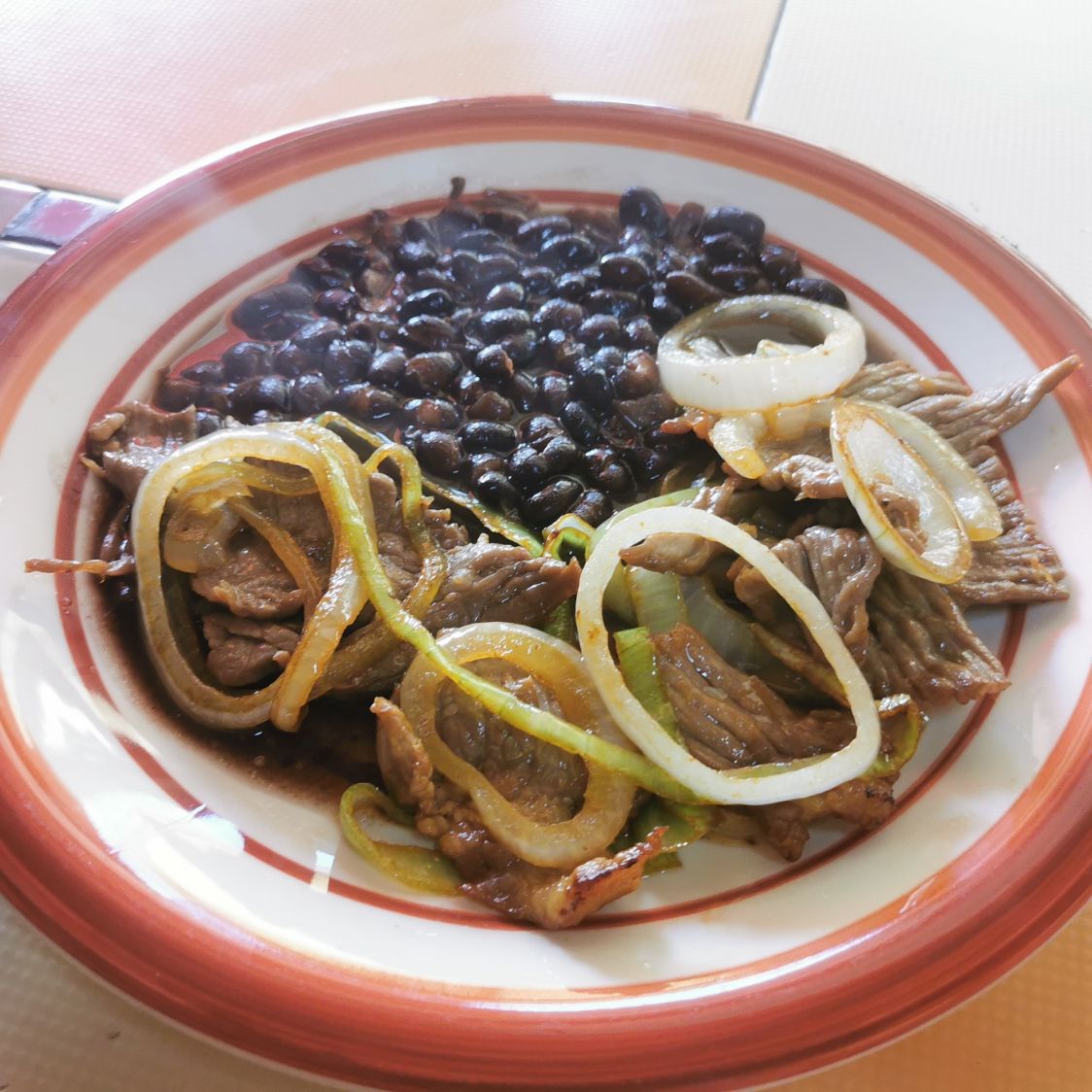 tasajo frita con cebolla, aceite, arroz y frijoles