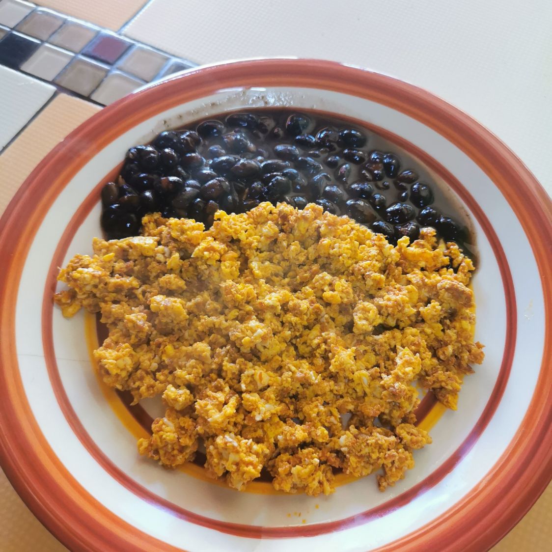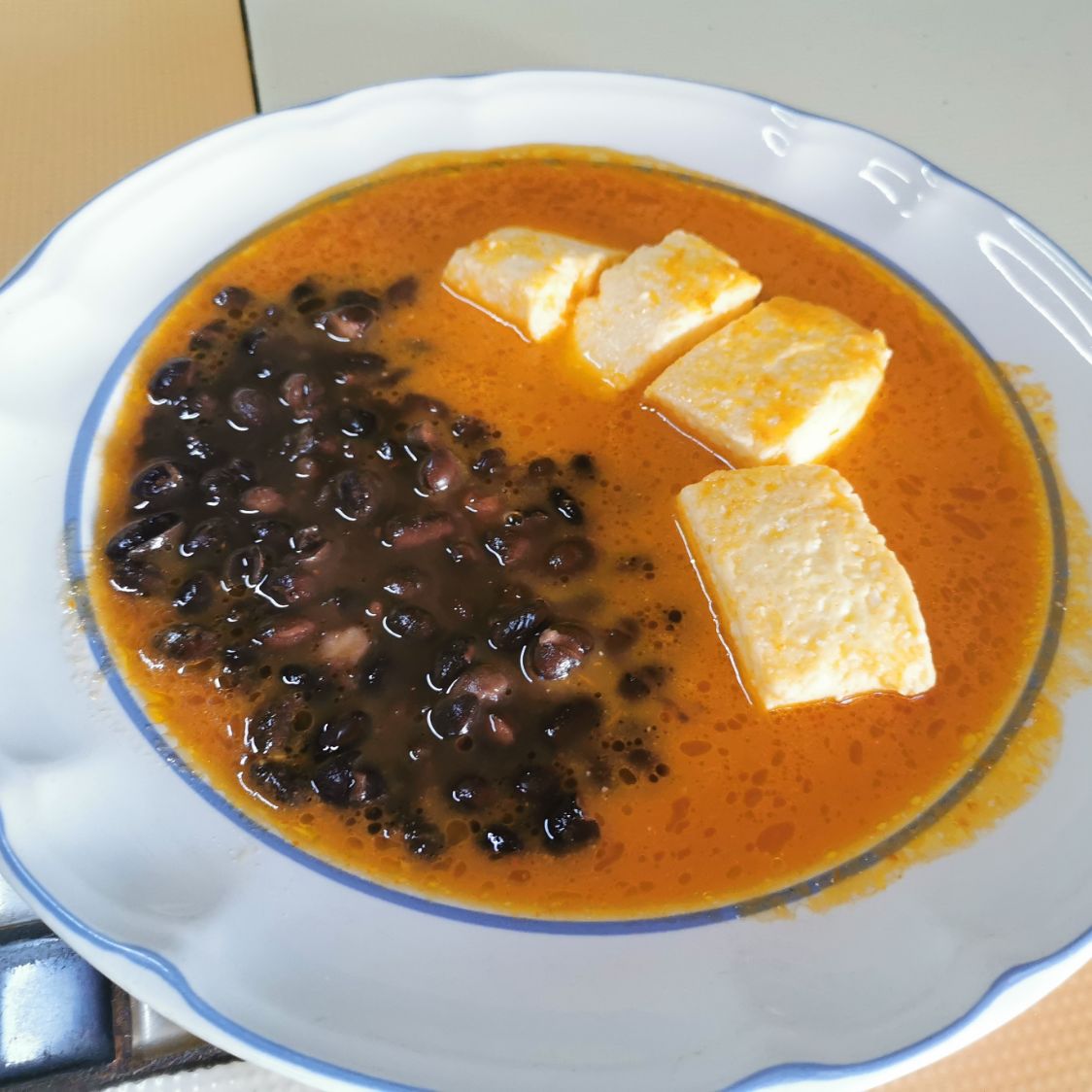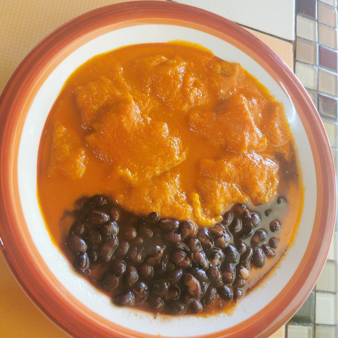 salsa un poco picante, queso frito, acompañada con arroz o frijoles