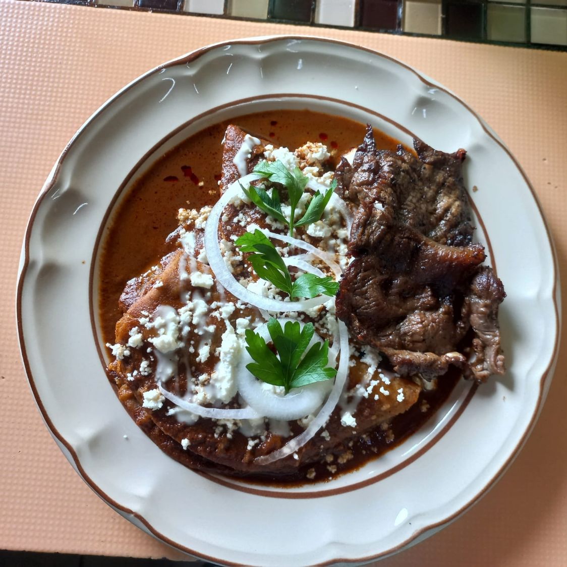 tortilla dorada, salsa roja, crema, cebolla, perejil, queso y carne, frijol