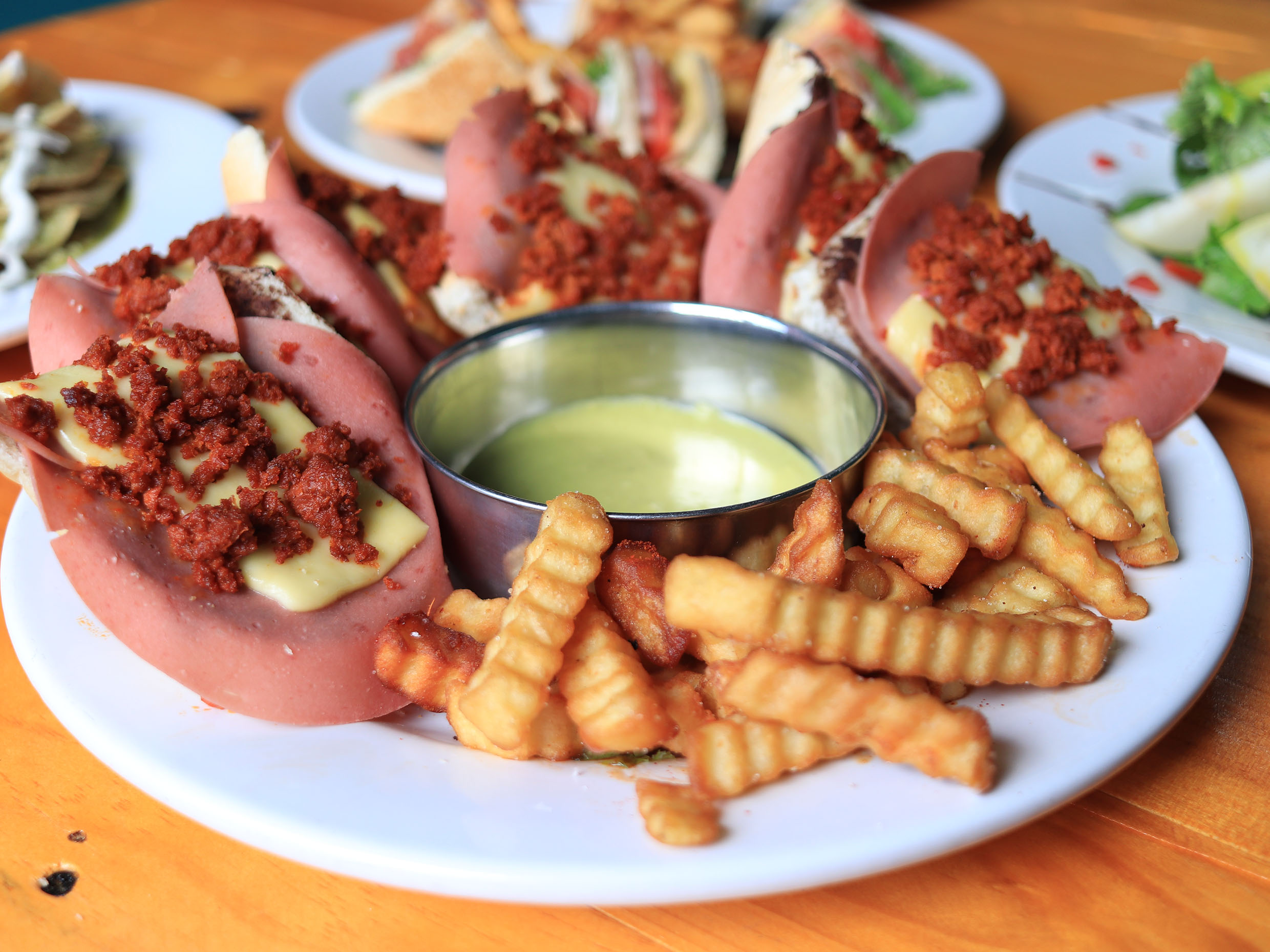 150 gr. de Jugosa Carne de Sirloin gratinada con queso manchego y acompañada de tocino, jamón de pavo, lechuga, tomate, cebolla y papas a la francesa (catsup y chiles en vinagre