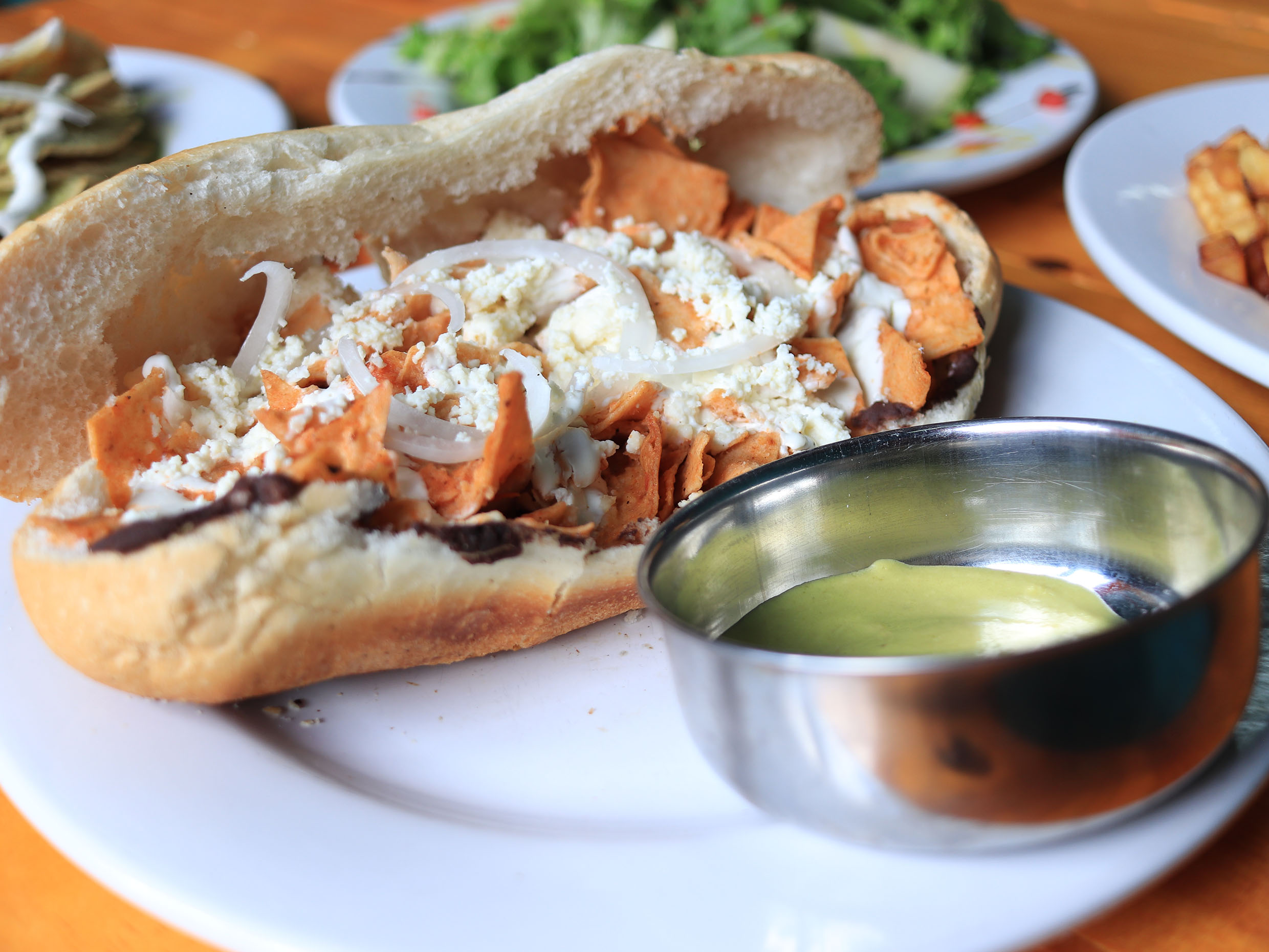 Pan Baguette de 20 cm de largo, untado con pasta de frijo y relleno de Totopos caseros bañados en salsa ( Roja o Verde) acompañados de Crema, Cebolla Fileteada y Queso fresco