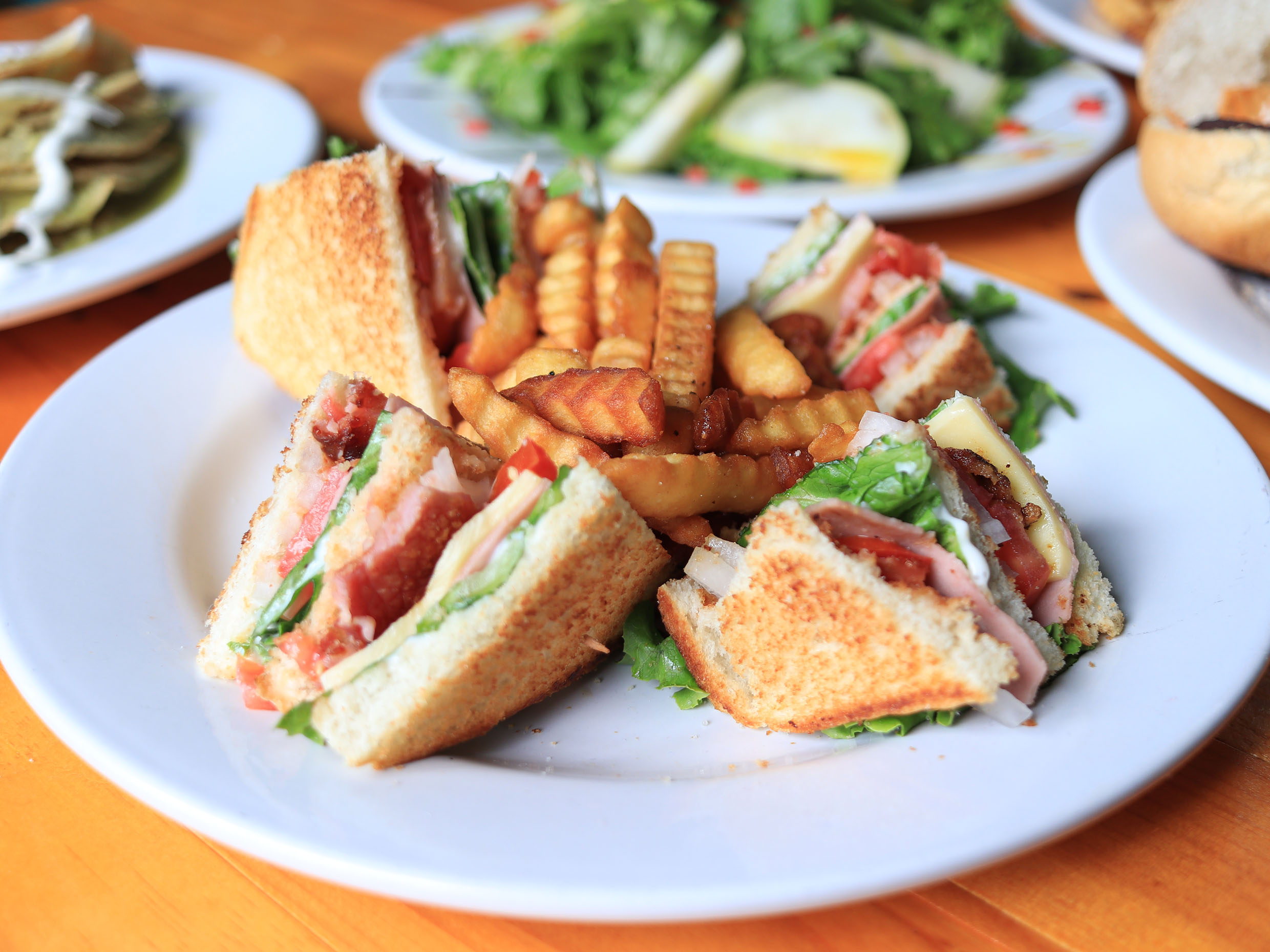 Torre de 3 panes relleno de Tocino, Jamón de Pavo, Queso Manchego, Lechuga, Tomate, Cebolla, Mayonesa y Acompañado de Papas a la Francesa a lado