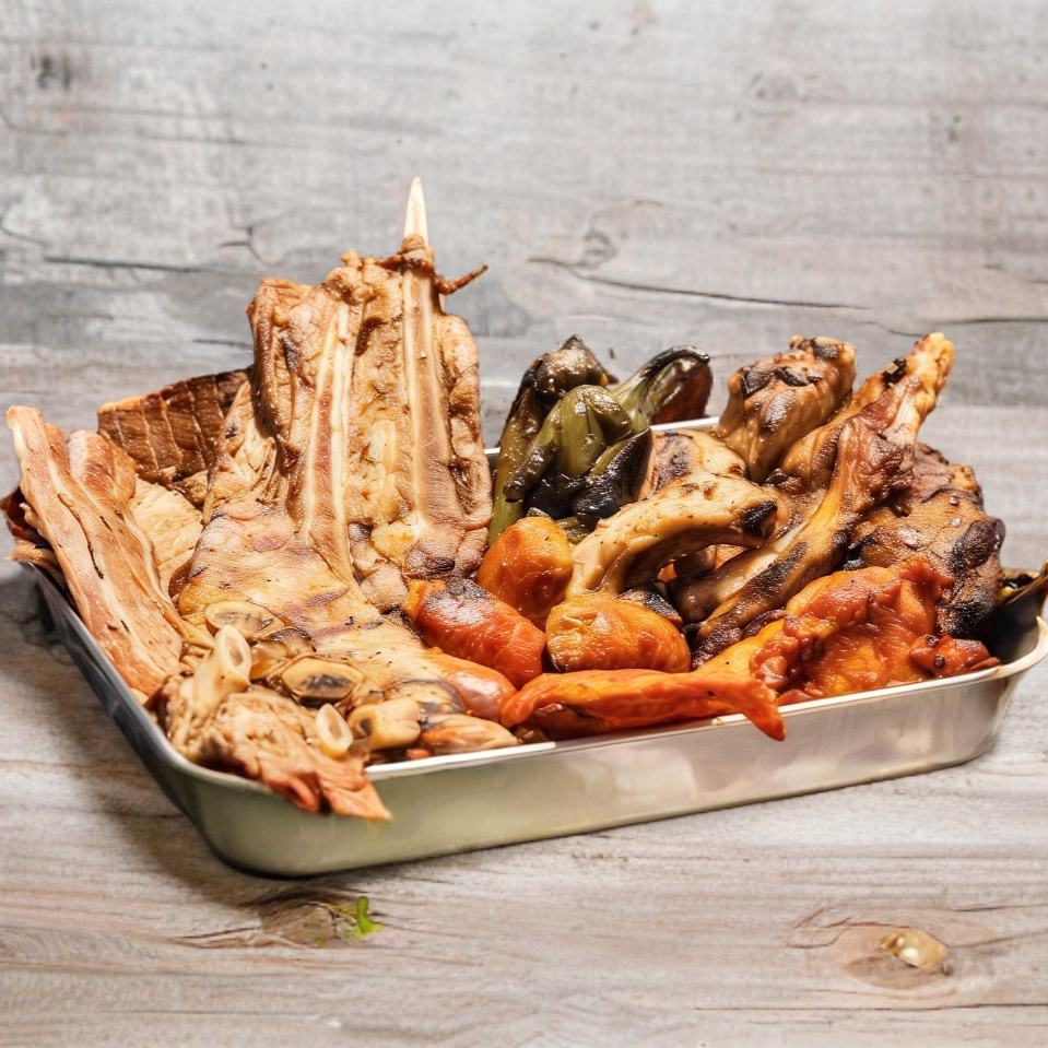 Tasajos marinados, Picañas, Short Ribs, Flechas , Salchicha para asar, Guarniciones, Tortillas, Papa Asada, Cebolla, Salsa y Guacamole