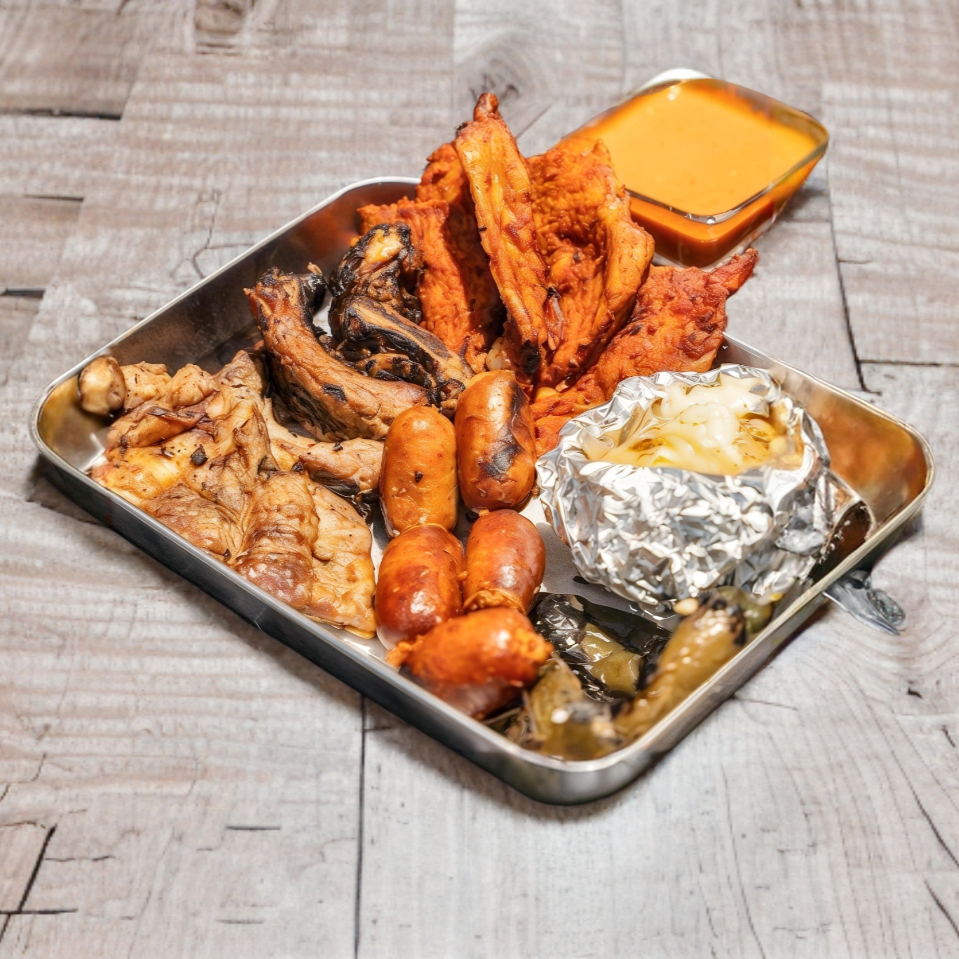 Costillas marinadas, Costillas BBQ, Chorizo rojo(8 pz.), Chorizo blanco (4 pz.), Cecina, Salchicha para asar, Tortillas, Guarniciones, Papa asada