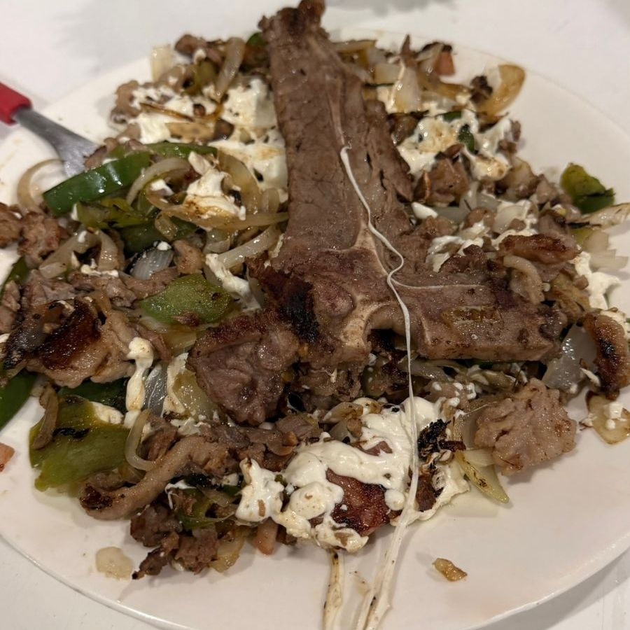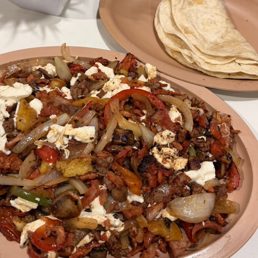 BISTEC, MORRON, CEBOLLA, QUESILLO Y TORTILLAS DE MAIZ