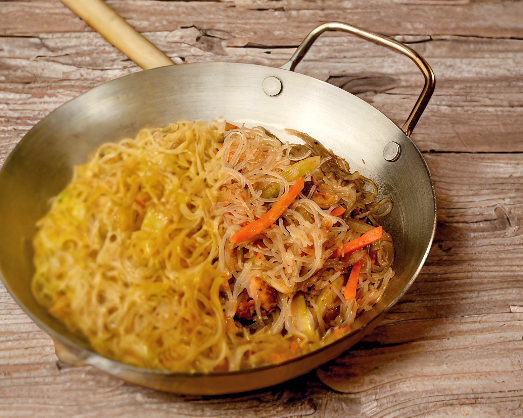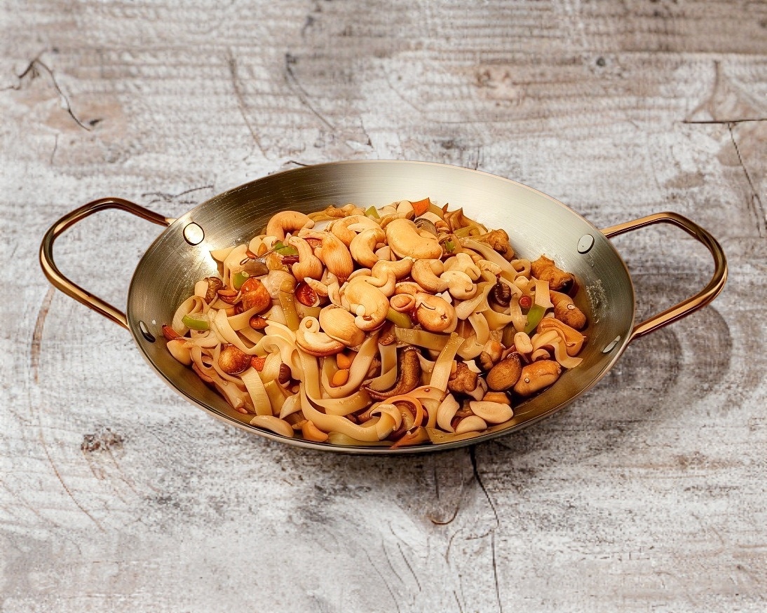 Fideos artesanales salteados en aceite de ajonjolí acompañados de un mix de verdura y cacahuate con pollo.