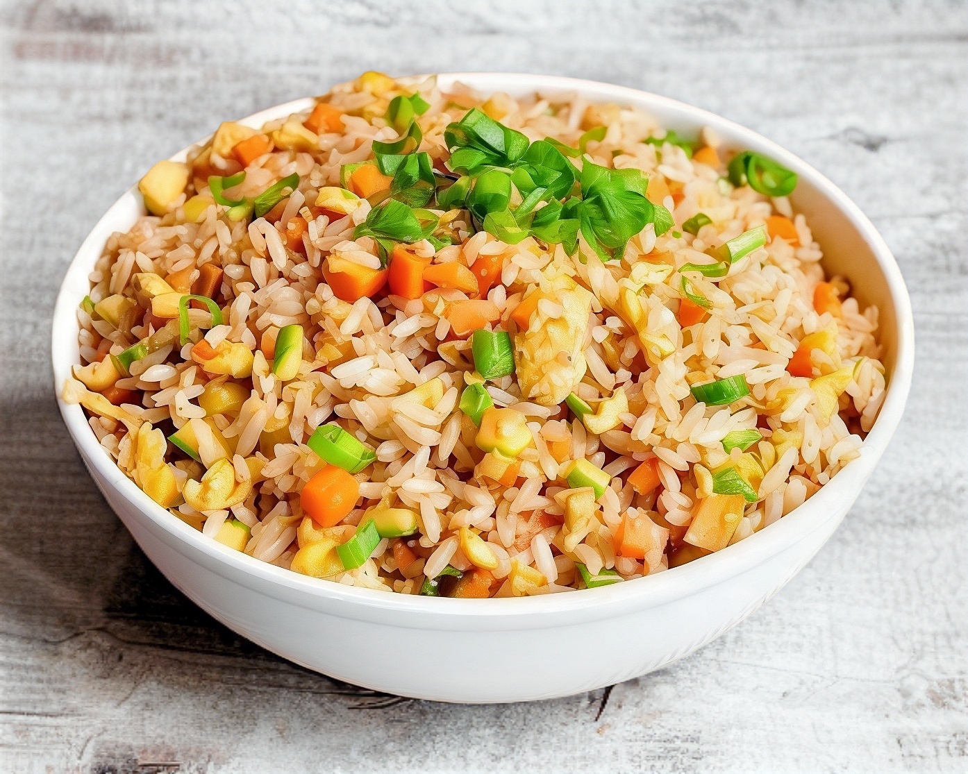 Fideos de arroz salteados en aceite de ajonjolí acompañados con un mix de verduras y cacahuate tostado con pollo.