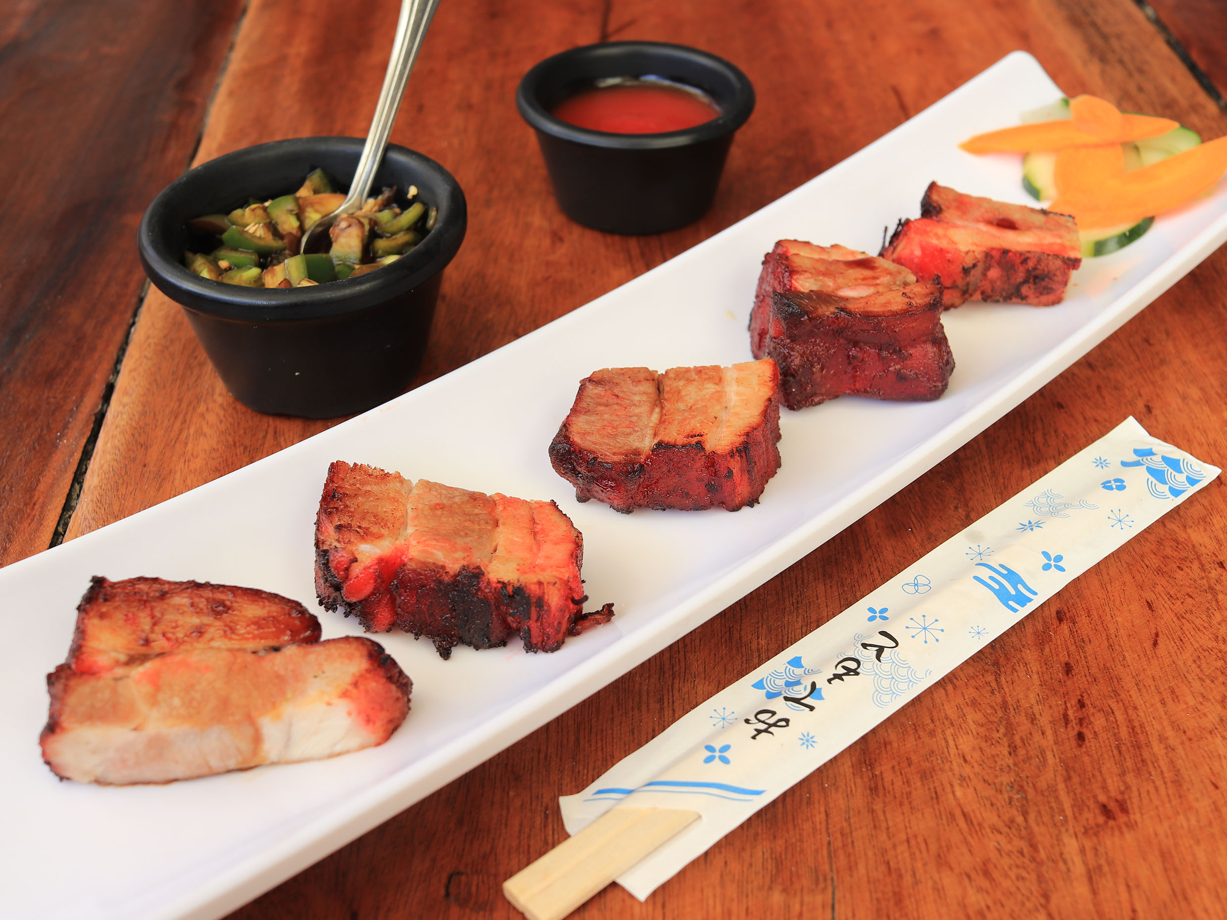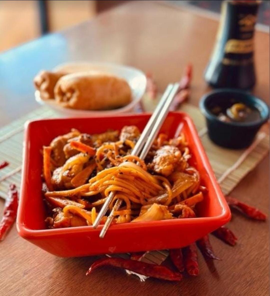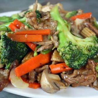 Carne marinada con especias orientales, chile de árbol, cebolla y champiñones.