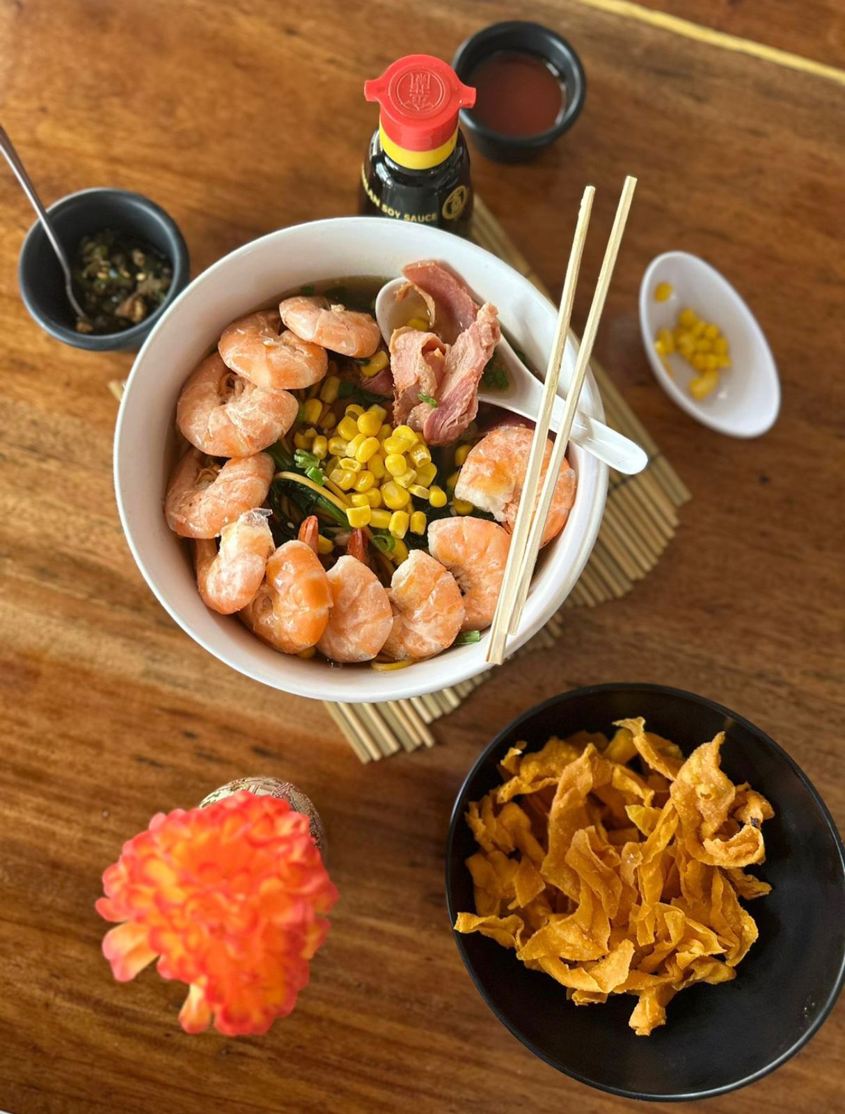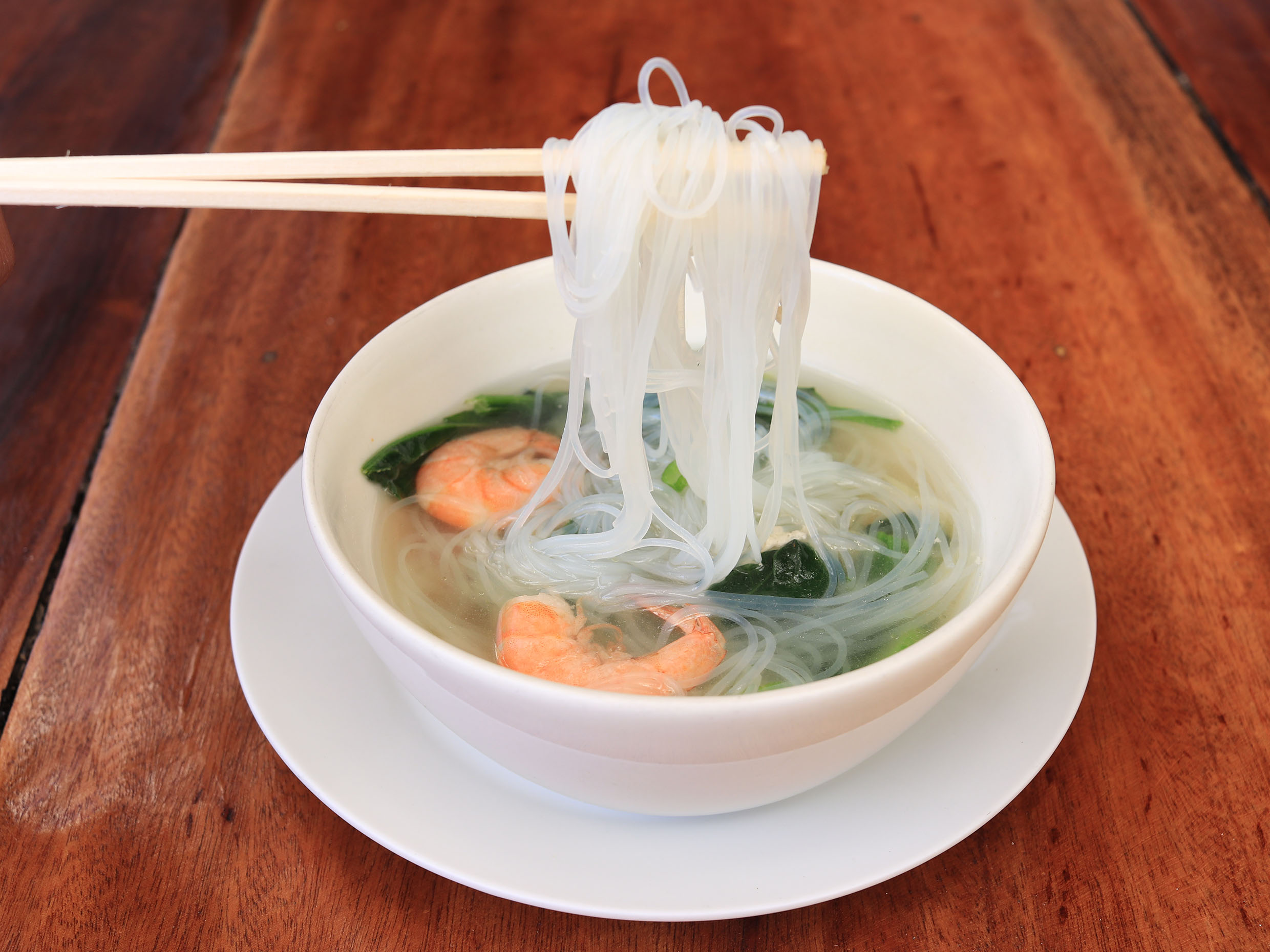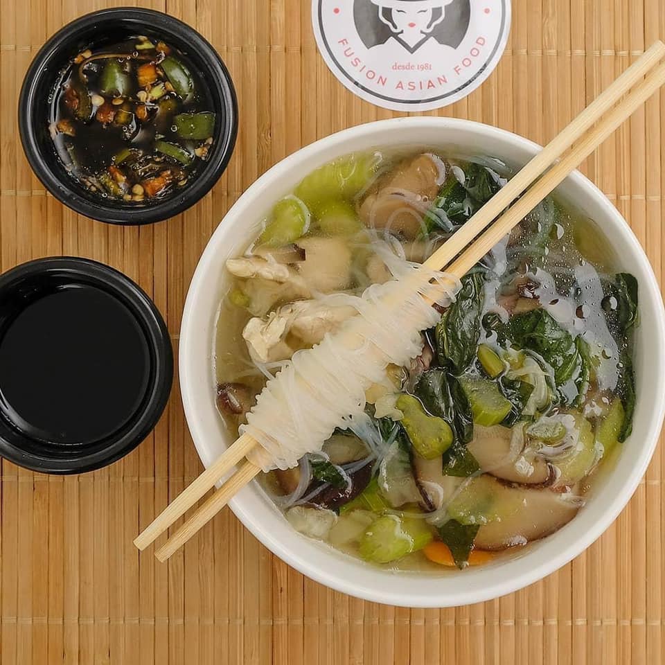 Verdura, hongo shilatake, pollo, camarón, fideos cristal.