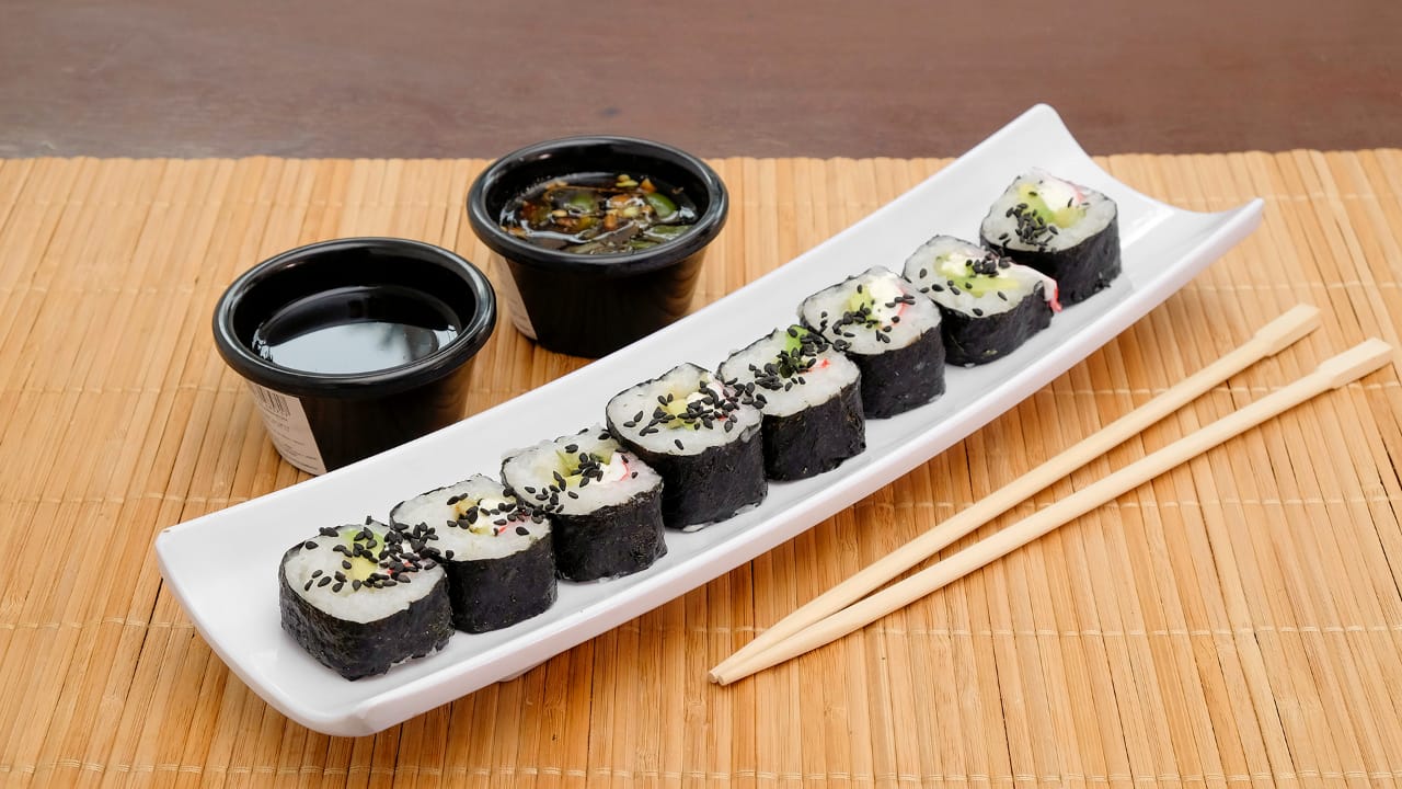 Arroz yakimeshi, aguacate, queso Philadelphia, alga marina, ajonjolí tostado y cebollín.