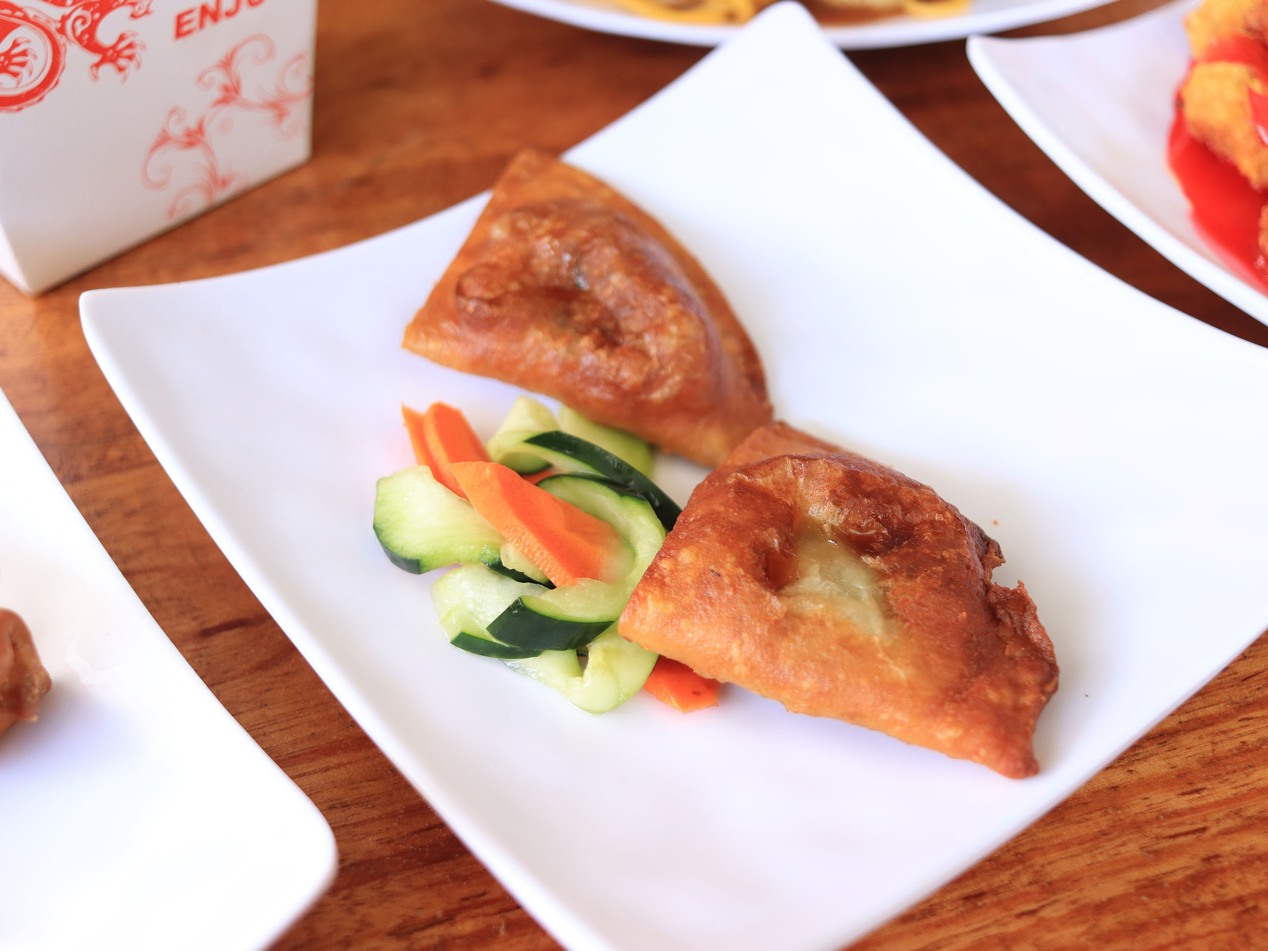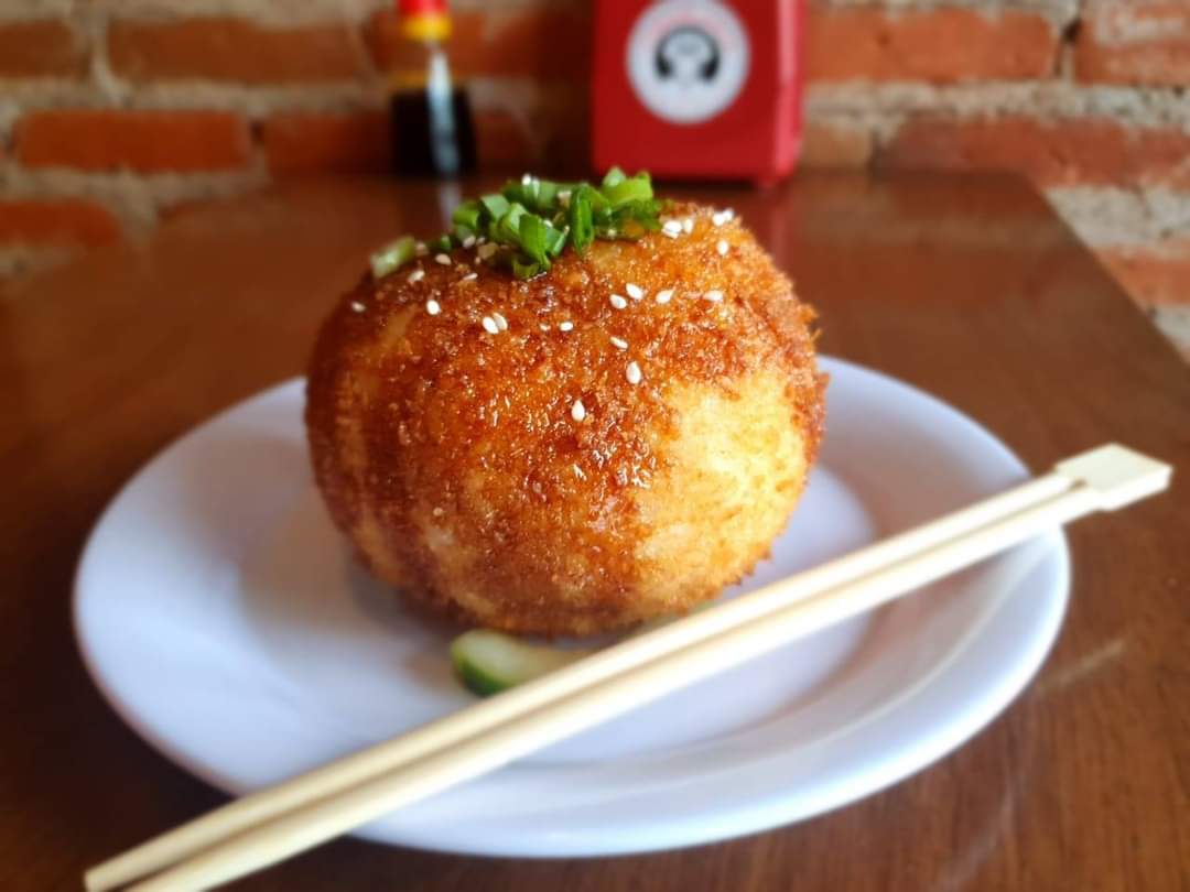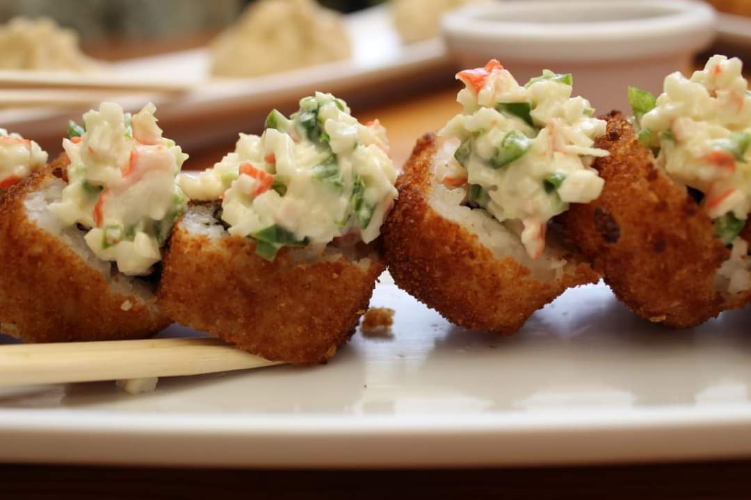 1 sushi California, 1 sushi empanizado tampico, 2 kushiages (queso), 2 dumpligs.