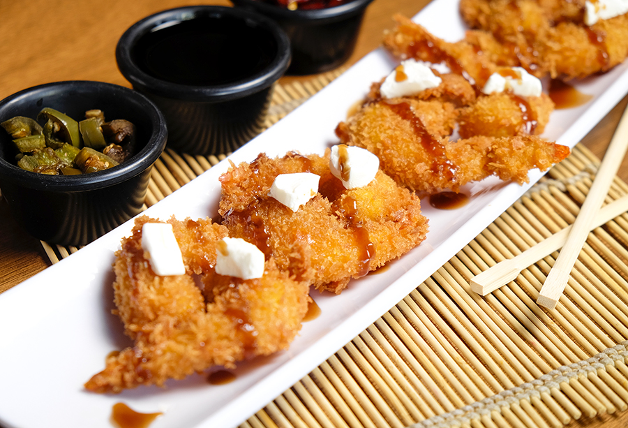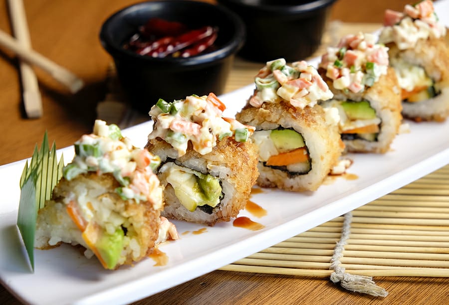 Rollo empanizado relleno de arracheramarinada, alga marina,queso crema, pepino, zanahoria, bañado en aderezo de Chipotle