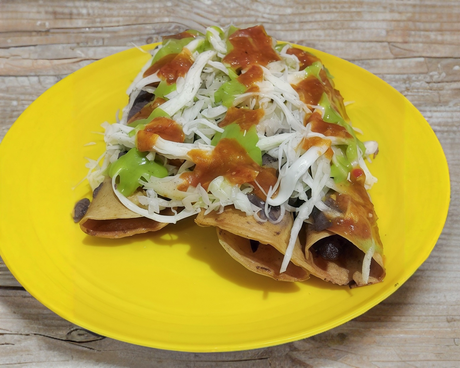 Orden de 3 tacos fritos rellenos de pollo, cubiertos de guacamole, frijol, lechuga y quesillo. (Tamaño personal)