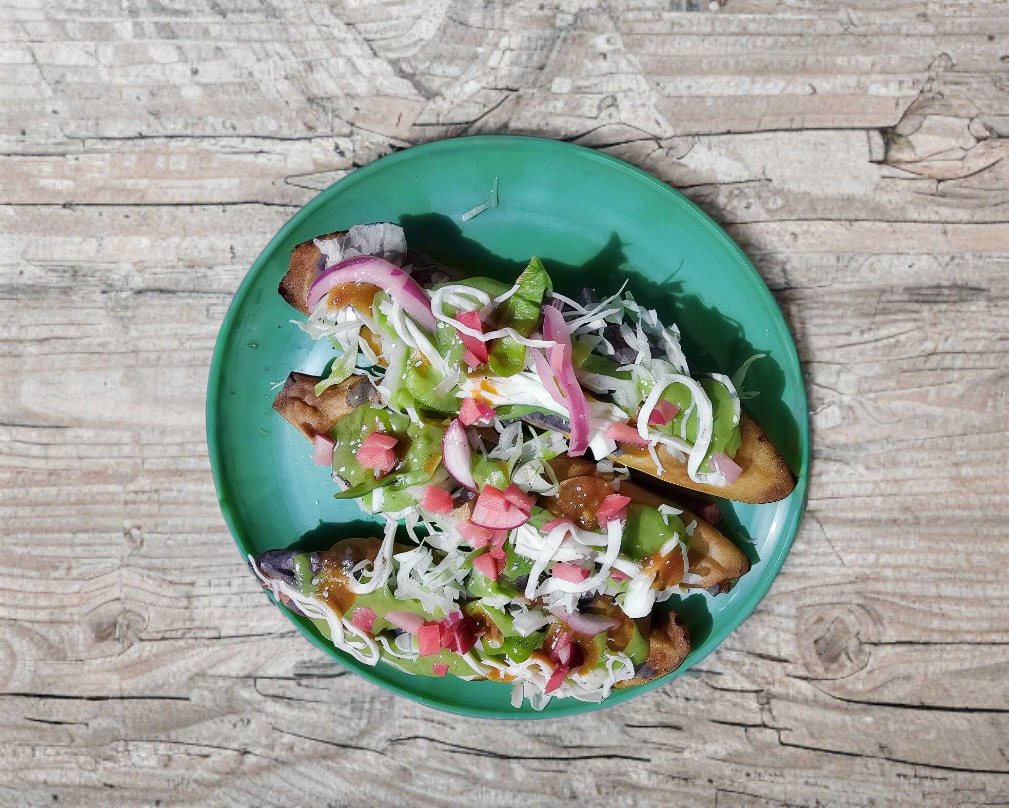 Tostada horneada, cuierta de pasta de frijol y guacamole con lechuga, tomate y quesillo.