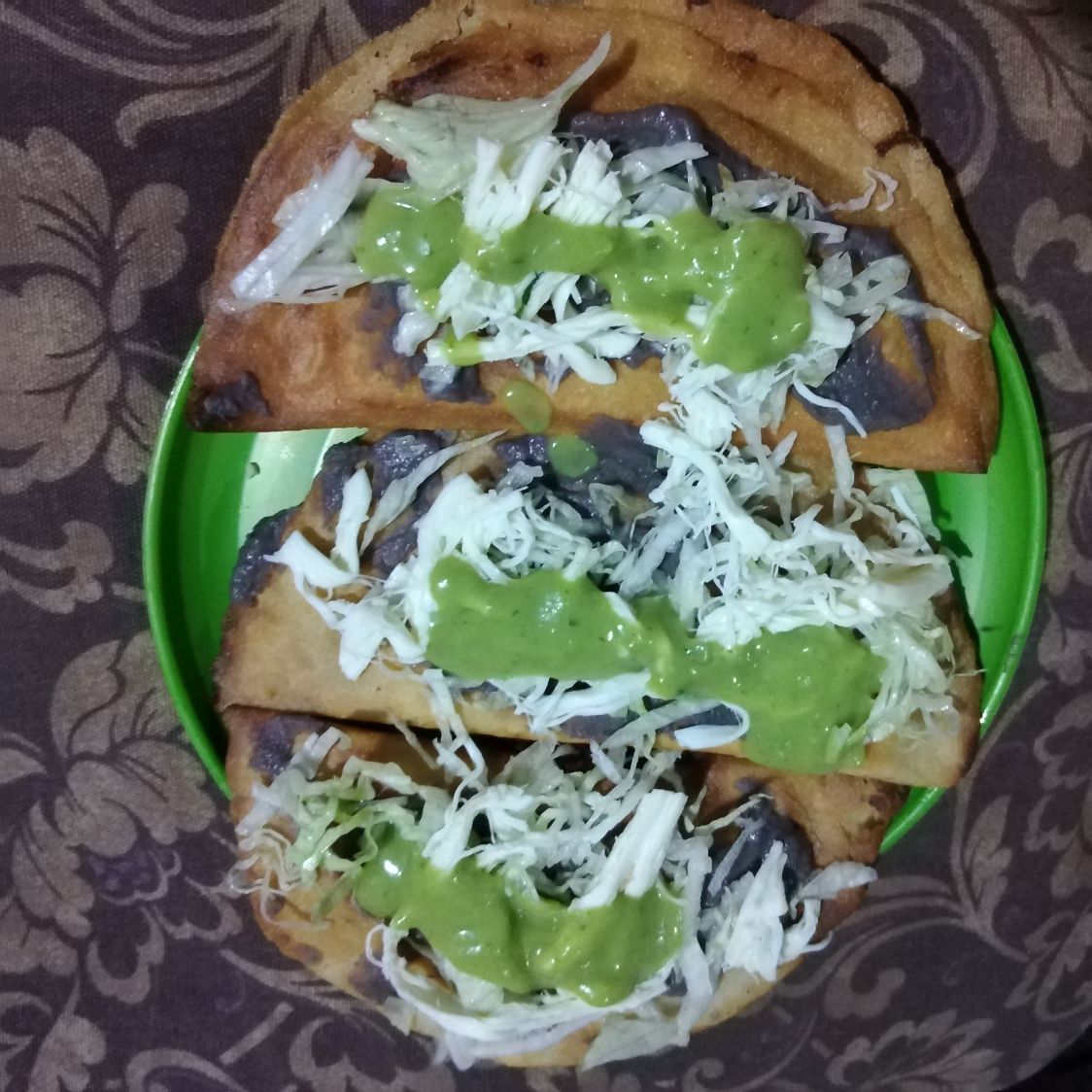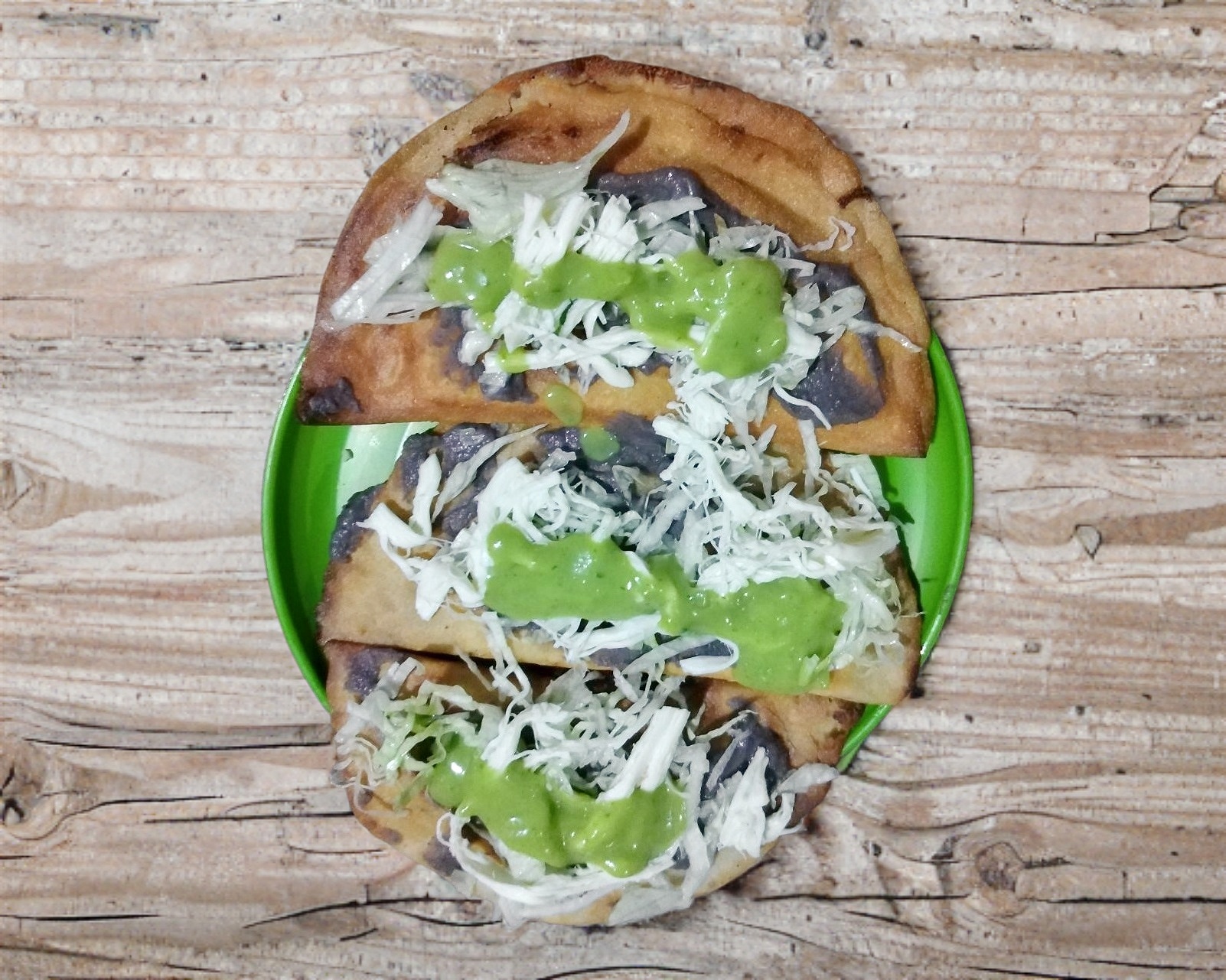 Orden de 3 quesadillas rellenas de quesillo, cubiertas con guacamole, pasta de frijol, lechuga.