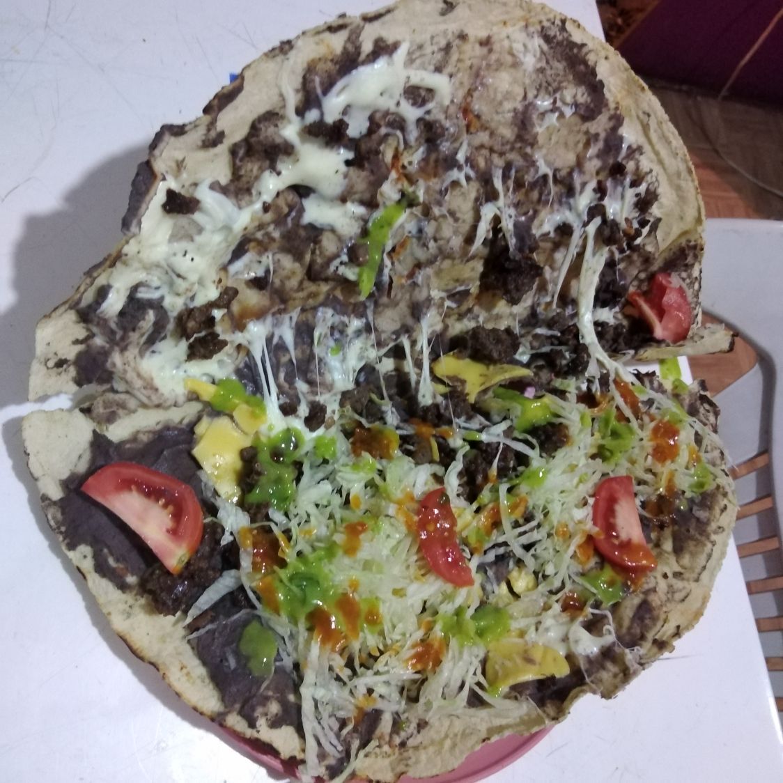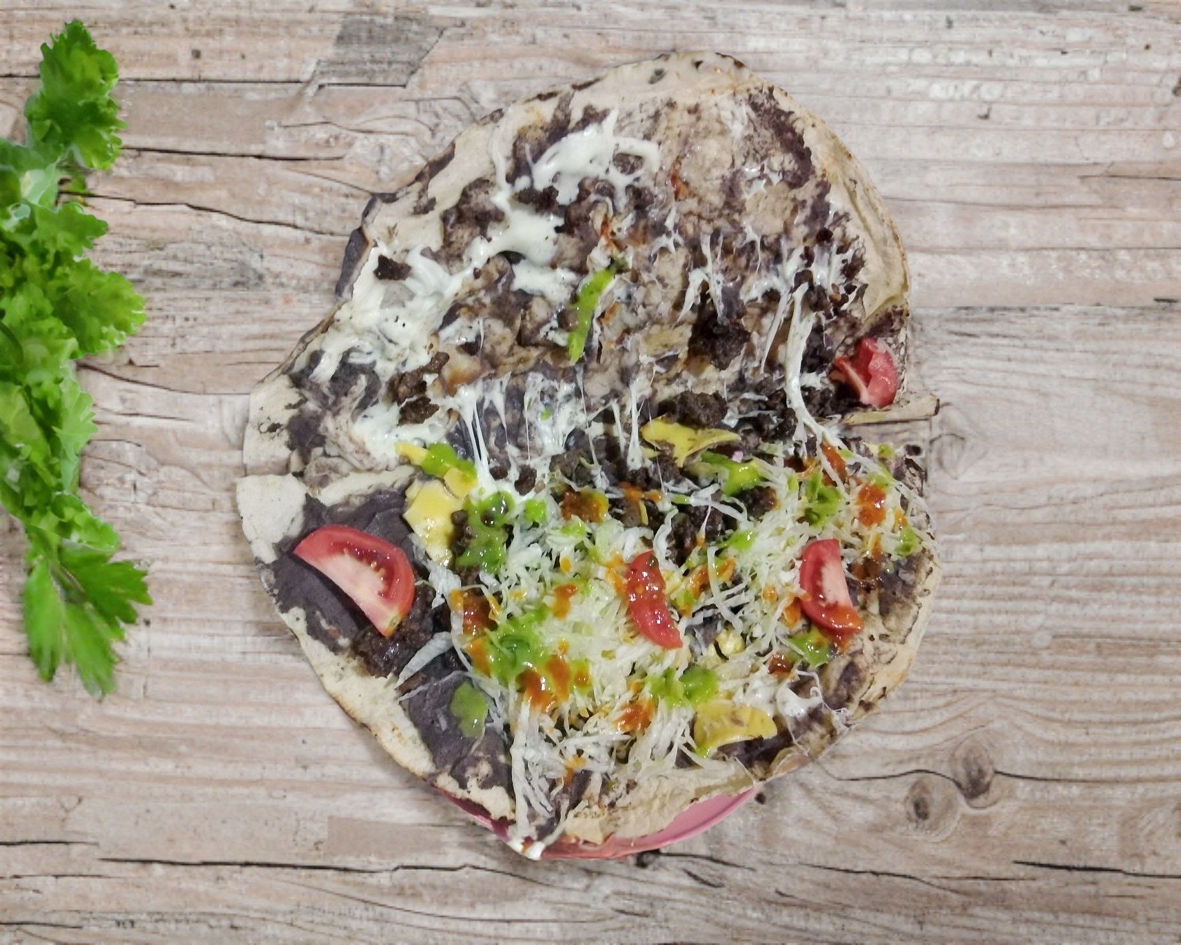 Tortilla hecha a mano con pasta de frijolitos refritos, salsita de chicharron y un toque de quesillo, lechuga y salsita picosita.