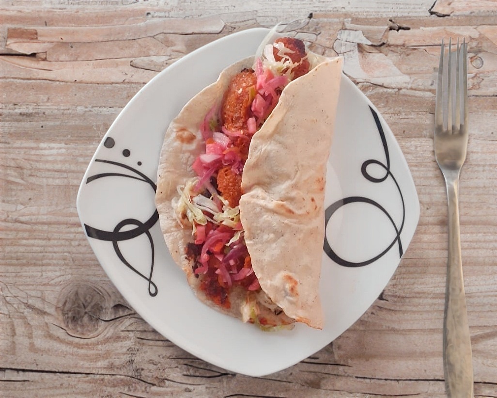 Tortilla hecha a mano con pasta de frijolitos refritos, milanesa de cochi y un toque de quesillo, lechuga y salsita picosita.