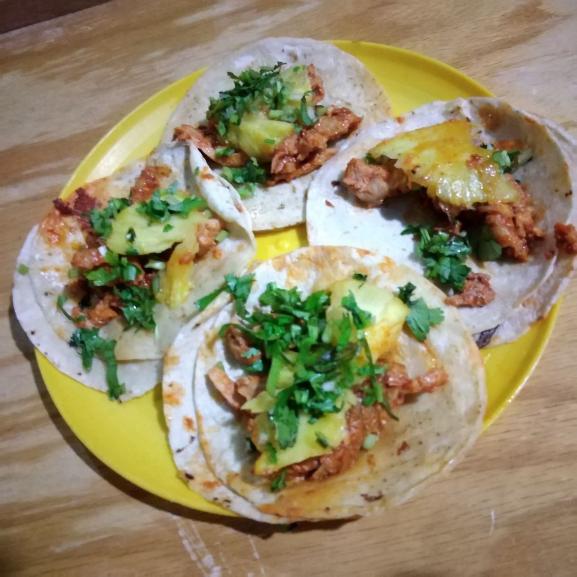 Orden de 4 tacos con cecina enchilada de puerco, piña natural asada, cilantro picado, guacamole y salsa.