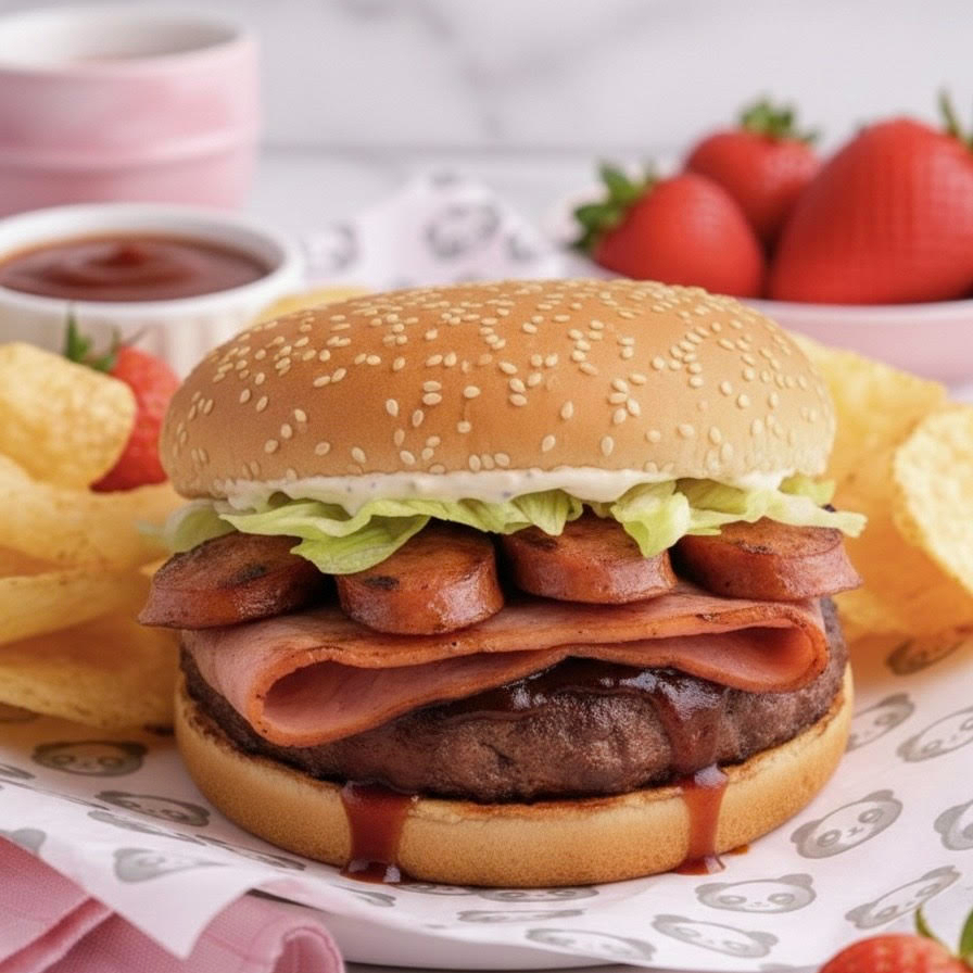 Carne de res bañada en salsa BBQ, acompañada de jamon, salchicha asada a la plancha, lechuga, tomate, un toque de mayonesa. Incluye papas fritas.