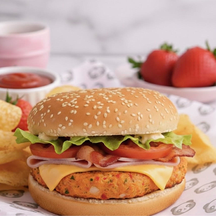 Nuestra burger lleva un medallón de pollo sazonado de la casa, queso amarillo, lechuga, tomate, mayonesa y acompañada de papas fritas.