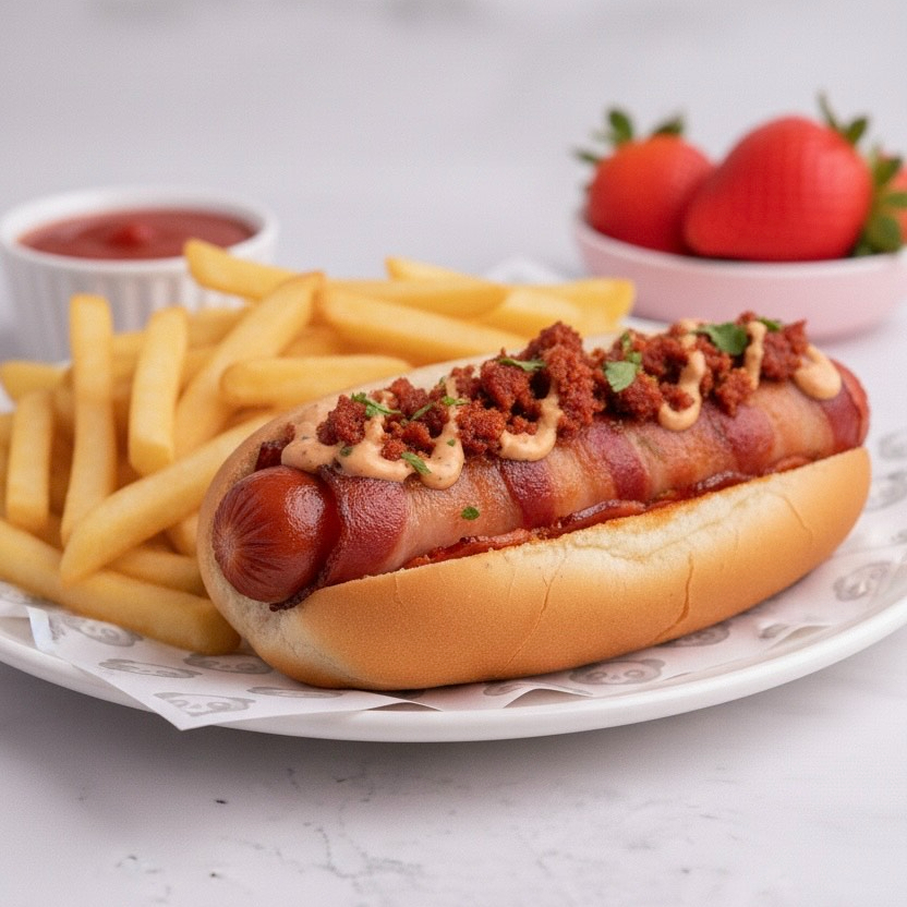 Versión premium con salchicha con chorizo y tocino acompañado de papas a la francesa.