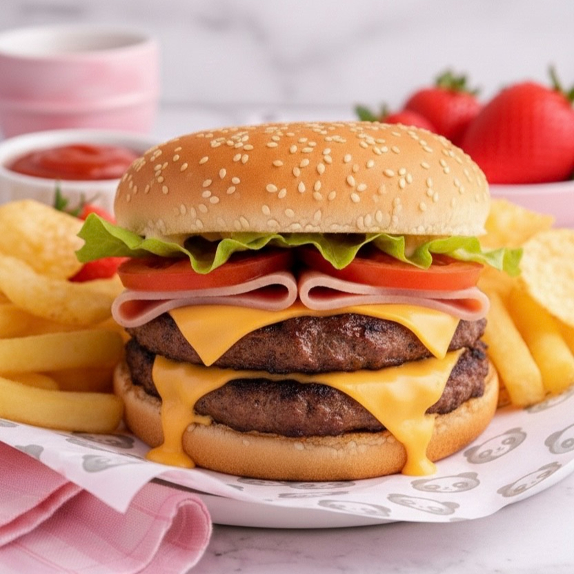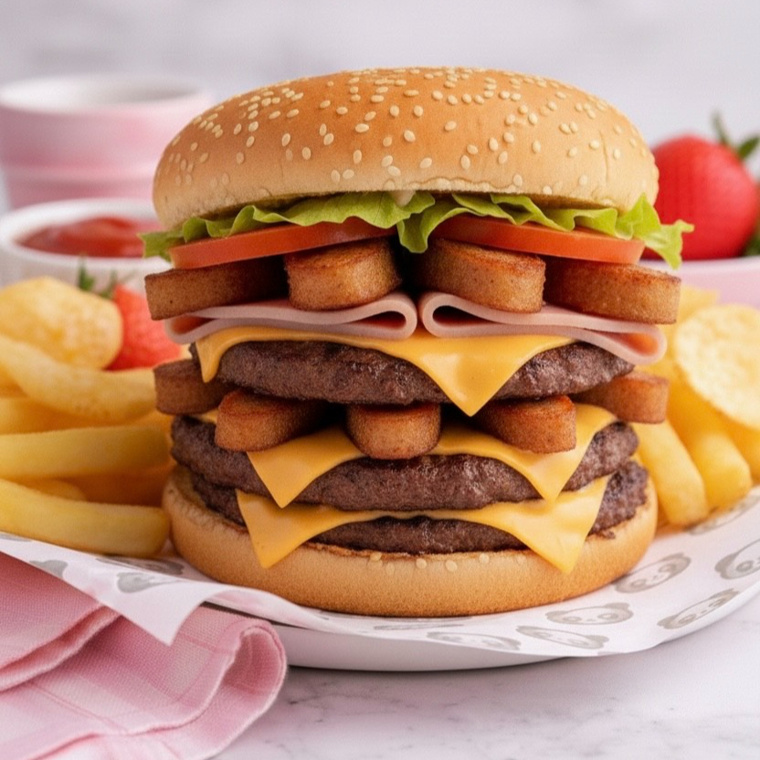 Tres niveles de carne jugosa, queso derretido y todos los extras. Incluye papas fritas.