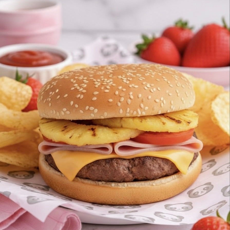 Jugosa carne de res, queso amarillo, jamon, tomate, lechuga y una buena rebanada de piña asada a la perfección.