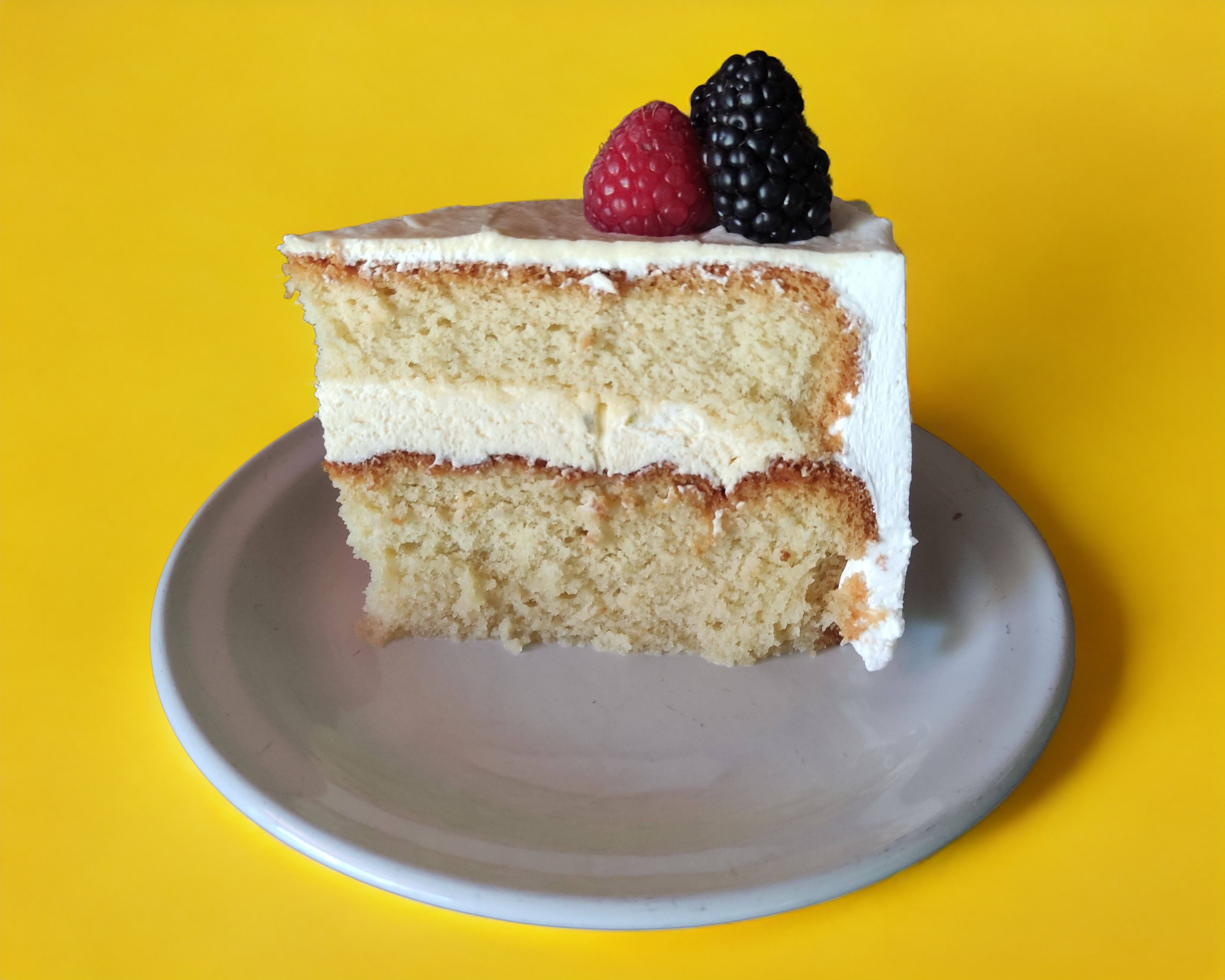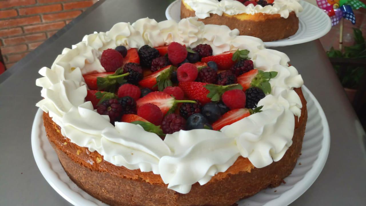 Delicioso bizcocho de vainilla bañado en un rico jarabe de la casa, relleno de mousse de limón, de la casa, decorado con Frutos rojos y crema