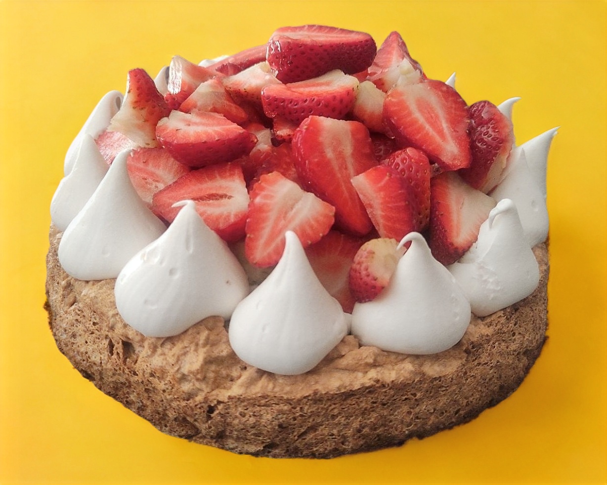 Base de merengue con nuez, crema irlandesa y fresas fileteadas