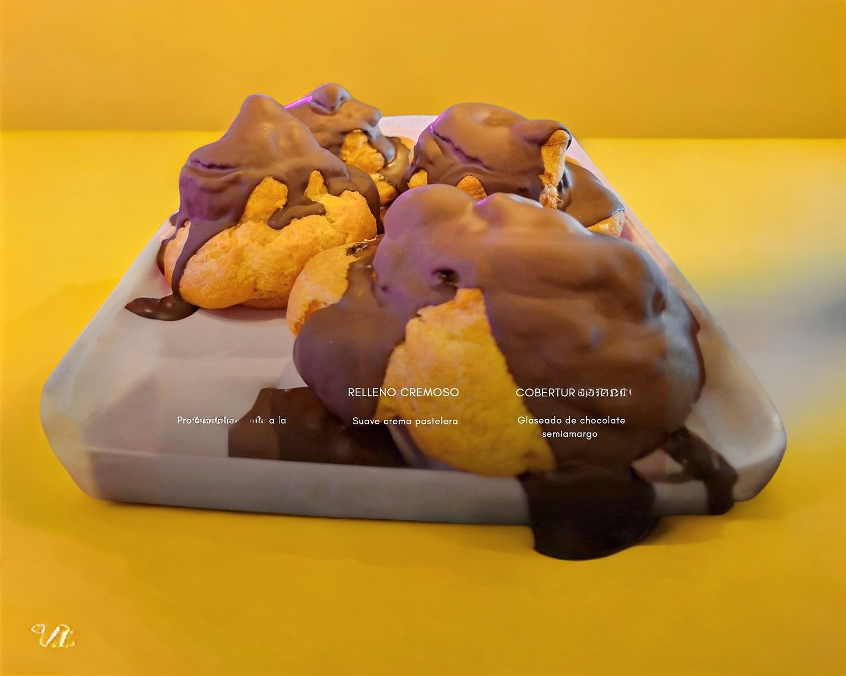 Delicioso choux relleno de crema pastelera y bañado en chocolate semi amargo