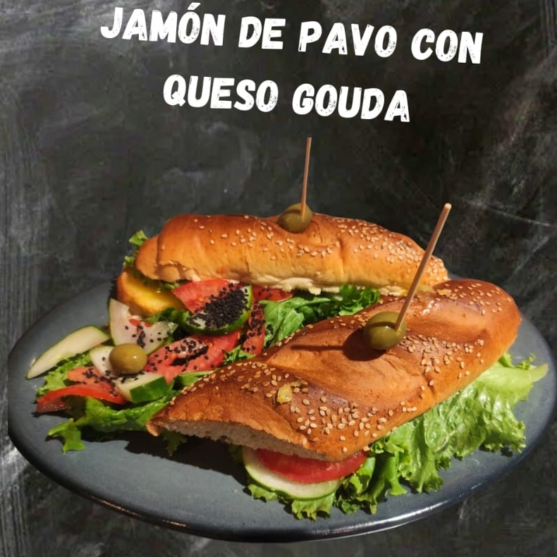 Delicioso baguette de jamón de pavo y queso gouda,acompañado de ensalada mixta