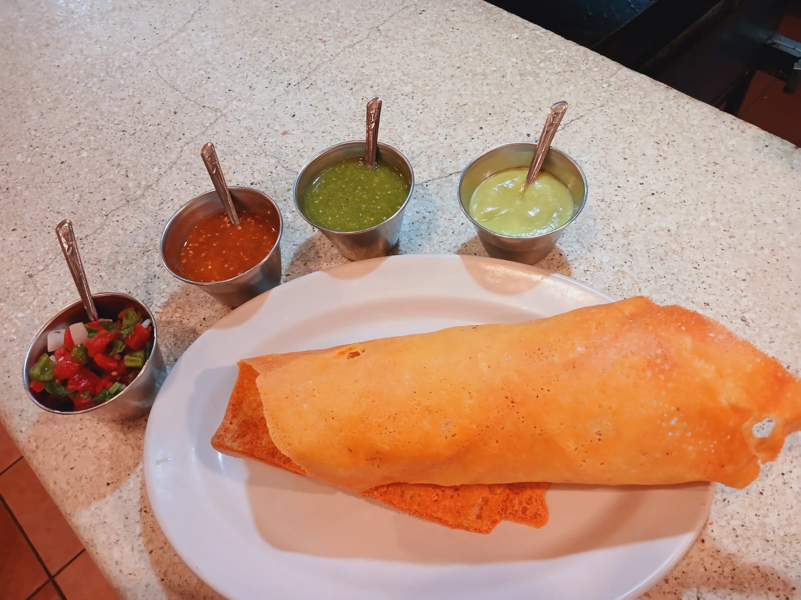 Tortilla de harina, aguacate y acompañados de frijol en pasta. Salsa de mesa y guacamole.