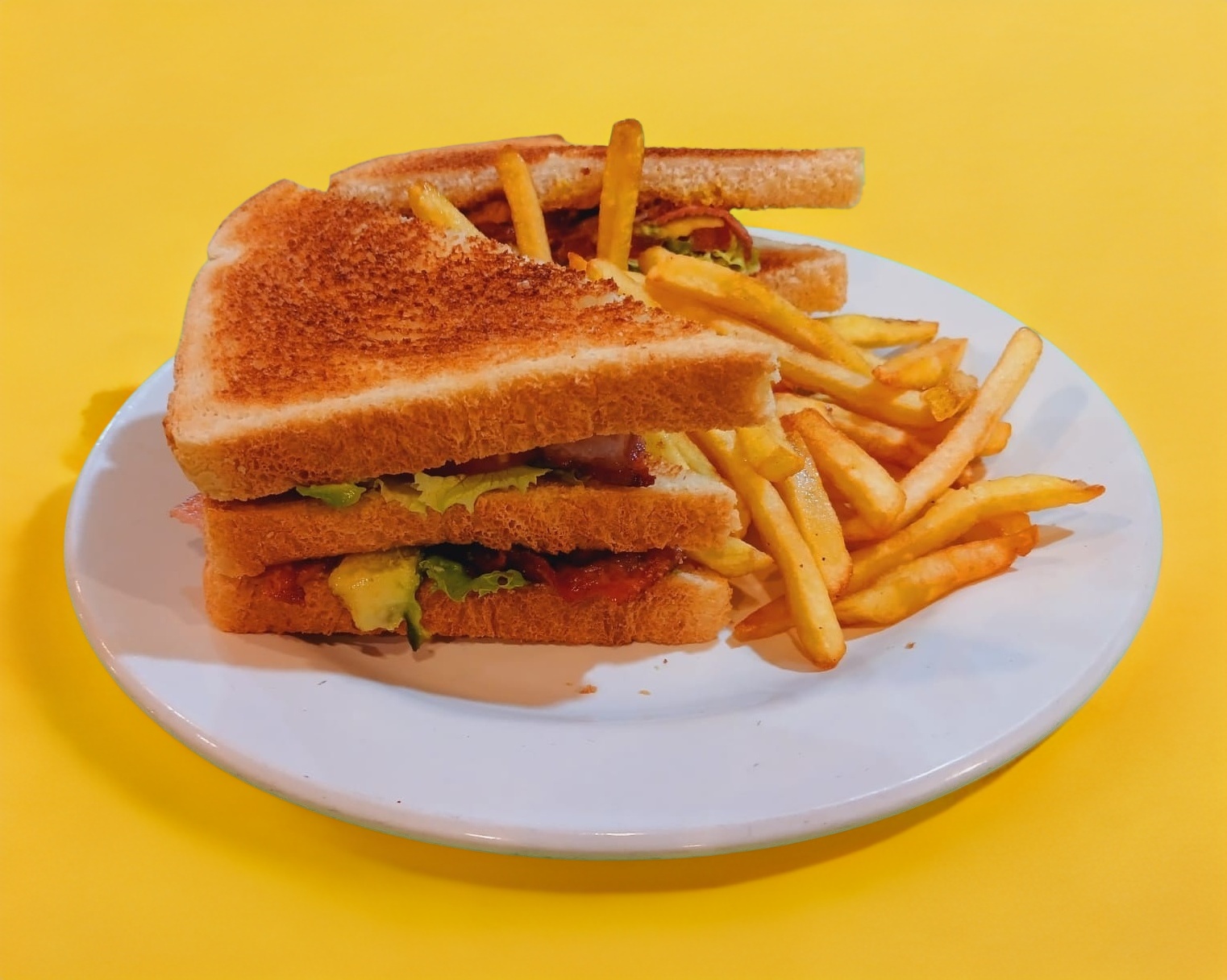 4 panes tostados, mayonesa, mostaza, tomate, aguacate, picante, tocino, jamón, queso amarillo y pechuga a la parrilla. Papas a la francesa o españolas.