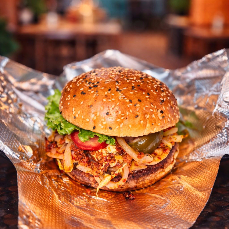 Doble carne, doble jamon, queso amarillo, lechuga, tomate, cebolla y chiles en vinagre.