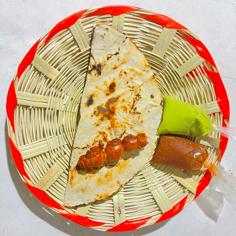 Tlayuda de tamaño mediano, con asiento, pasta de frijol, col (repollo), quesillo Y Chorizo (chorizo en pasta ya dentro de la tlayuda) Acompañado unicamente de salsa y guacamole.