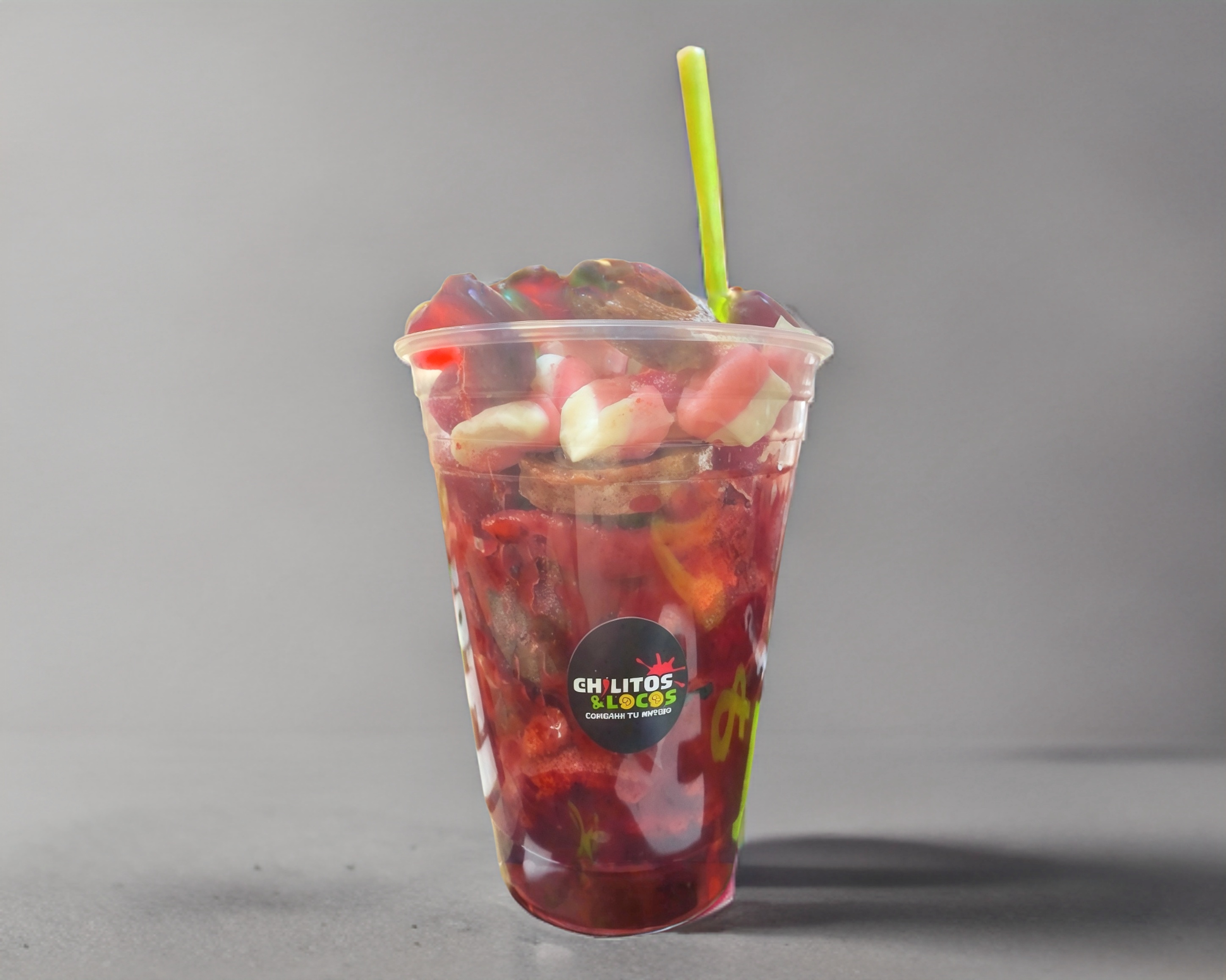 Vaso de 24 onzas escarchado con chamoy y todas las gomitas de la barra revueltas con chamoy y miguelito