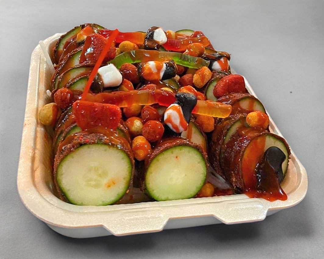 Pepino cubierto con tamarindo, chamoy, miguelito, cortado en rodajas, sobre una cama de jícama, con 5 toppings, salsa, chamoy, miguelito, tajín y limón