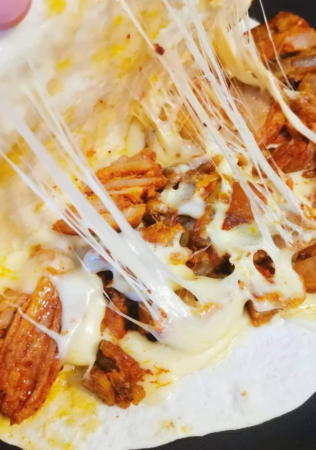 Pastor, piña morron, cebolla, queso y quesillo.