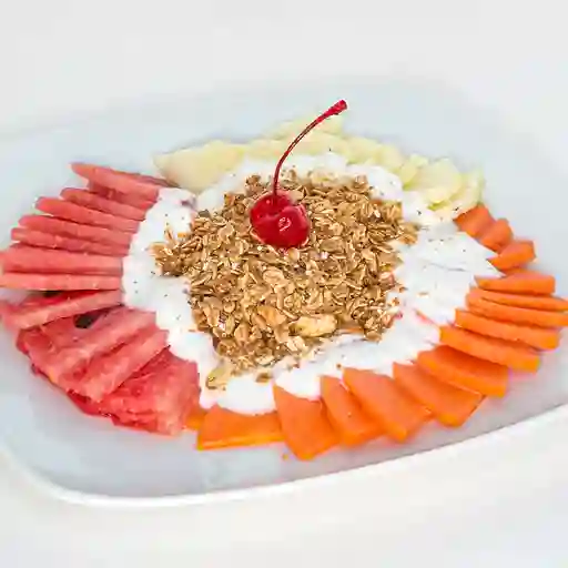 Plato de frutas con granola e ingrediente y tamaño a elegir.
