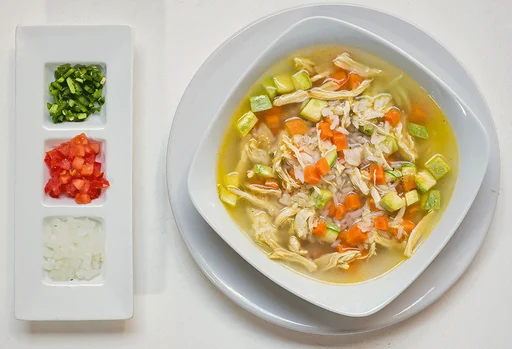 Consomé de pollo con arroz blanco, calabaza, zanahoria y pollo deshebrado. Guarnición de limón, cebolla y chile verde picado.