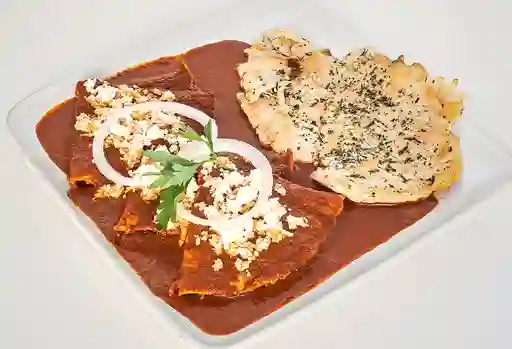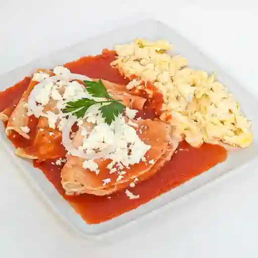 Enchiladas con cebolla, perejil, acompañadas con pan bolillo, crema ácida, proteína y preparación a elegir.