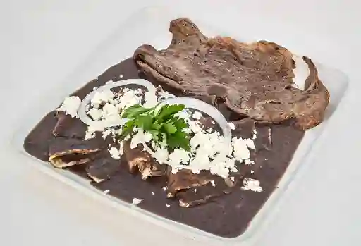 Enfrijoladas con cebolla, perejil, acompaña con pan bolillo, crema ácida y proteína.