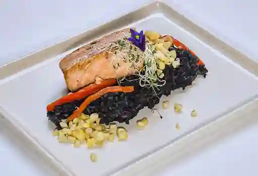 Arroz negro con salmón y huitlacoche.