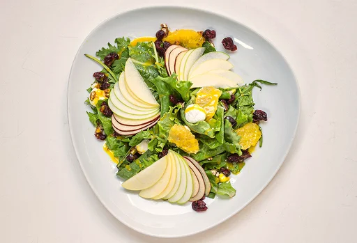 Mix de lechugas, arándanos, nuez caramelizada, supremas de naranja, manzana amarilla, roja y verde, queso de cabra y aderezo de mostaza con miel.